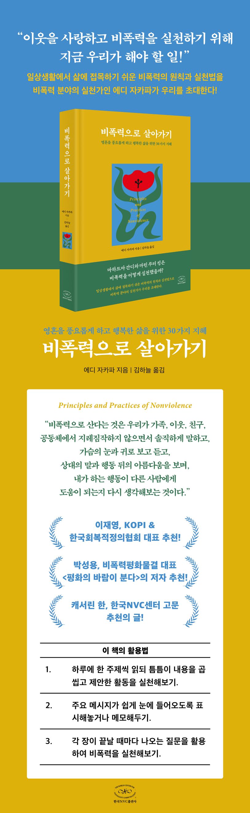 이 책의 효과적인 활용법으로 지은이는 하루에 한 주제씩 읽되 틈틈이 내용을 곱씹고 제안한 활동을 실천해보기를 권한다. 자기만의 속도와 리듬에 맞춰서 읽어 나가되 처음부터 끝까지 쭉 읽어 나가는 것도 한 가지 방법이다. 주요 메시지가 쉽게 눈에 들어오도록 표시해놓거나 메모해두면 몰입하는 데도 도움이 되고 나중에 그 주제로 돌아와서 생각하기도 편하다. 또한 각 장이 끝날 때마다 나오는 질문들은 비폭력을 실천하도록 우리를 돕는다.