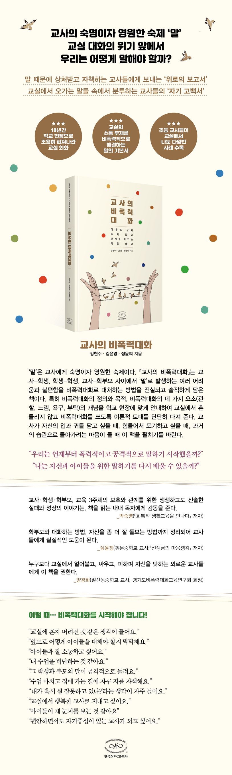 우리는 언제부터 교실에서 폭력적이고 공격적으로 말하기 시작했을까? 교사는 자기 자신과 아이들을 위한 말하기를 다시 배울 수 있을까? 이 책은 비폭력대화가 한국에 들어온 이후 약 18년간 학교 현장으로 조용히 퍼져나간 교실 회화 격인 ‘비폭력대화’를 보다 전문적으로, 보다 깊고 생생하게 다룬 책이다. 특히 교사들이 교실에서 겪은 다양한 사례와 대처 방법을 수록하여 독자들에게 실질적인 도움이 되고, 대화의 위기를 근본적으로 해결할 말과 마음의 뿌리를 제시한다. 교사의 말과 마음이 살아야 교육이 바로 선다! 교실에서 오가는 말 때문에 상처받고 자책하는 교사들에게 보내는 ‘위로의 보고서’이자, 학교 현장에서 있었던 수많은 대화의 순간과 그 속에서 분투하는 교사들의 비폭력대화를 낱낱이 보여 주는 『교사의 비폭력대화』가 많은 이들에게 도움이 되기를 바란다.