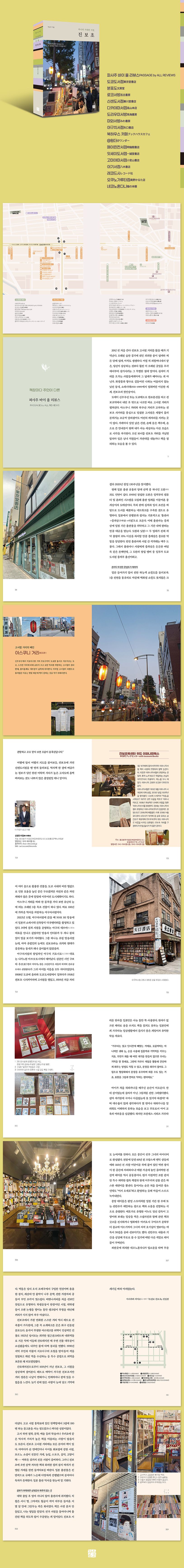 일본 근대화 이후 오랜 시간 진보초에 자리 잡은 유서 깊은 서점, 새로운 모습으로 변화된 젊은 서점 등 18곳을 찾아가 그들이 만든 역사와 지속 가능한 비결을 듣고 기록했다.