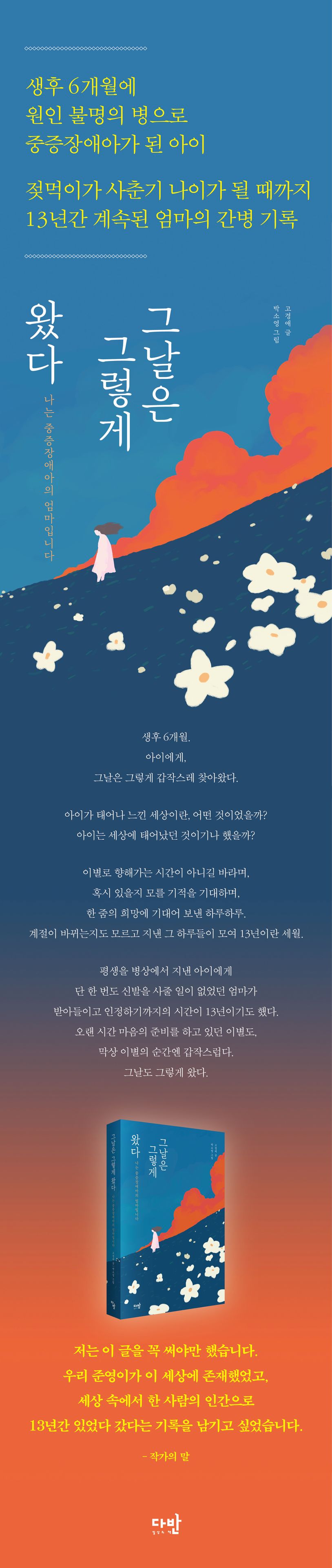 아이를 떠나보내던 날, 모든 사람은 ‘끝났다’고 했지만, 그녀는 그때부터 ‘시작’임을 느꼈다. 시간이 멈춘 듯했던 날들, 서서히 흘러갔던 준영이와의 13년간을 이야기하면서 이 세상의 또 다른 준영이들과 그 부모들에게 희망과 위안을 건네고 싶다. 그들의 눈물을 멈추게 할 수는 없겠지만, 그 눈물을 조금이나 닦아줄 수 있는, 그녀의 눈물로 엮은 작은 손수건이 되길 바라며…