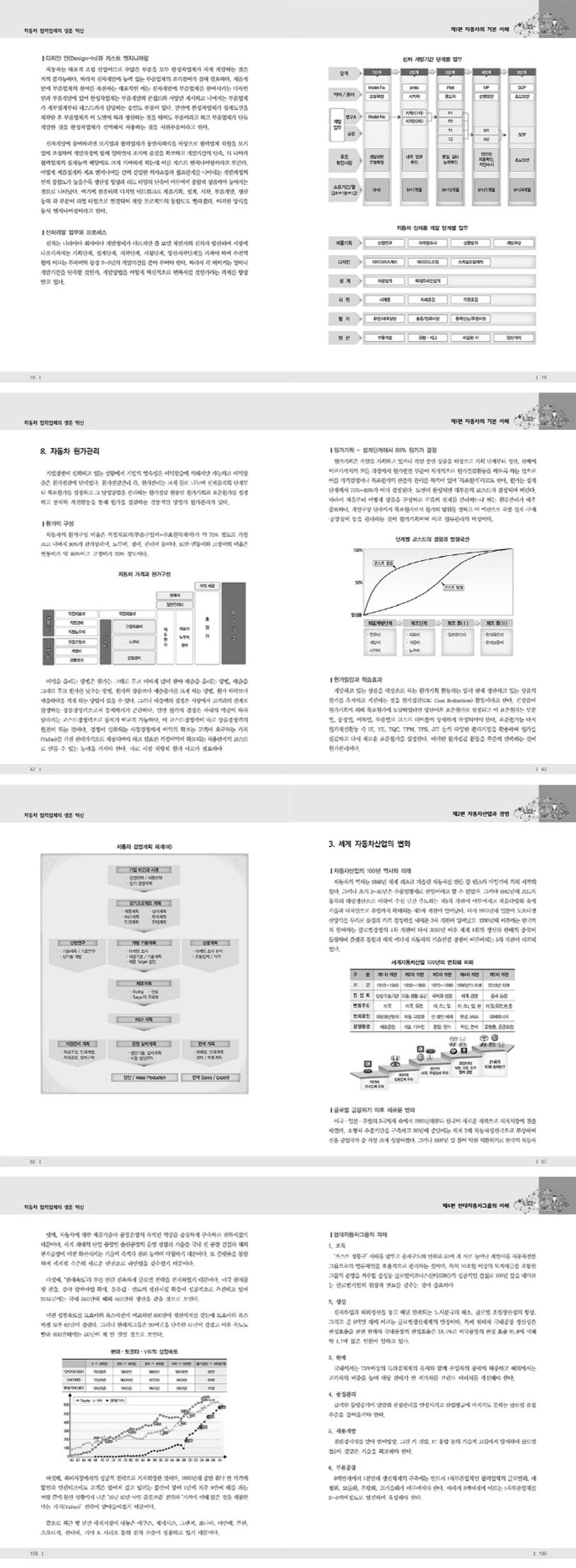 [자동차 협력업체의 생존 혁신]은 자동차 협력업체가 앞으로 나아가야 할 방향을 제시해주는 관리 매뉴얼이다. 자동차 산업 전반, 현대자동차그룹의 이해, 도요타자동차의 벤치마킹을 통해 노사, 생산성, 품질, 원가, 구매개발, 납기부분의 개선과 혁신을 알아 볼 수 있다.