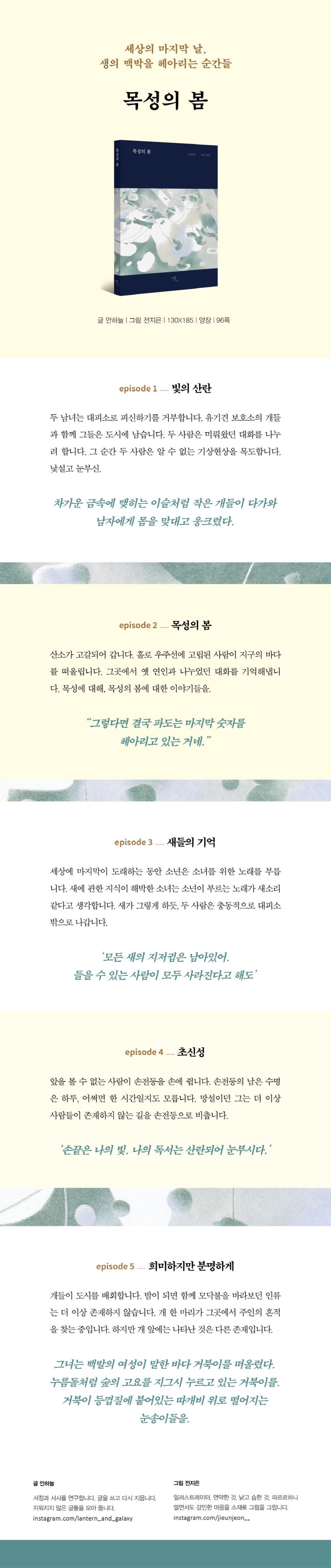 《목성의봄》은종말을앞둔세계에서반딧불처럼빛나는삶의순간들을그립니다.작품속캐릭터들은한계적상황에서비로소생의의미를질문하게됩니다.상실의기억,그럼에도이어져오는추억의온기를통해그들은삶을입체적으로재감각합니다.세계의한계와자연의지속.그사이연결고리로서인간이생을모색하는과정을감각적으로그리고있습니다.'목성의봄'은문학적깊이와인문학적조망을통해우리시대를묘사하는서사의초상화를남깁니다.