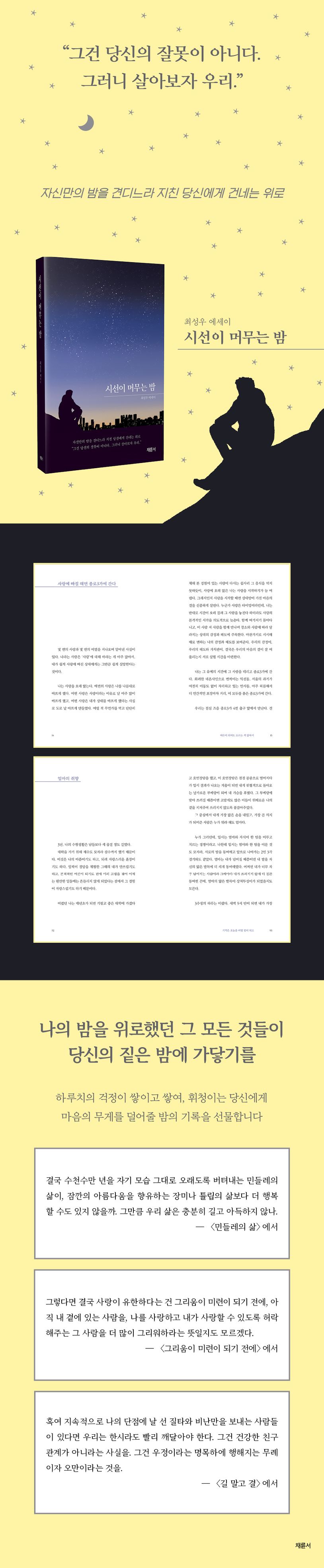 밤은 사소한 감정들에 집중하기 좋은 시간이다. 작가는 이 시간에 글을 쓴다. 소음도 빛도 가라앉은 고요함 가운데에 앉아, 어떤 기억 속에 어떤 감정을 느꼈는지 그래서 어떤 말을 하고 싶은지 곰곰이 따지는 과정을 거쳐 글을 완성한다. 이 과정 속에 작가는 아픔을 치유하고 내일을 살아갈 힘을 건네는 법을 배웠다. 이제 그는 자신처럼 휘청이고 있을 누군가에게 손을 내밀려 한다. 자신을 위로했던 그 밤의 기록들이 이제는 누군가의 짙은 밤을 위로하고 내일을 살아갈 힘이 되길 바라는 마음으로 말이다.