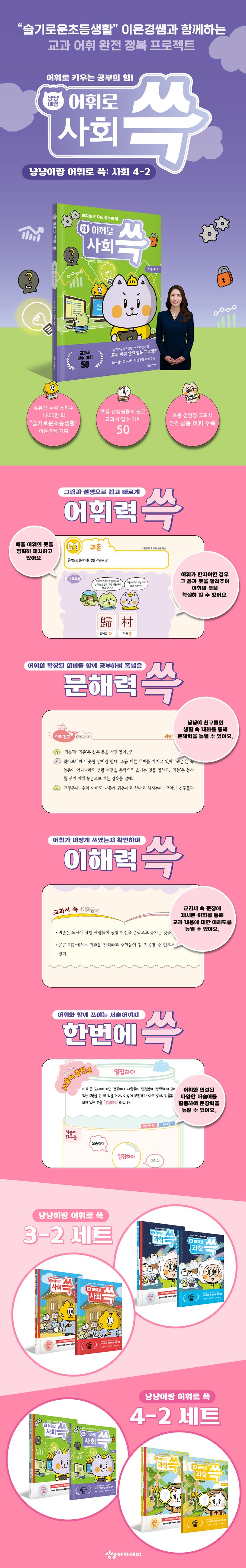〈냥냥이랑 어휘로 쓱: 사회 4-2〉은 초등 4학년 2학기 사회 교과서에 나오는 50개의 핵심 어휘를 소개한다. 어휘 50개만 잘 익히면, 4학년 2학기 과학 내용을 다 끝낼 수 있도록 구성하였다. 여기에 어휘를 잘 습득할 수 있도록 〈냥냥이랑 어휘로 쓱: 사회 어휘연습장 4-2〉을 함께 준비했다. 어휘연습장에 나온 문제를 풀다 보면 본책에 나온 어휘를 충분히 이해할 수 있을 것이다.