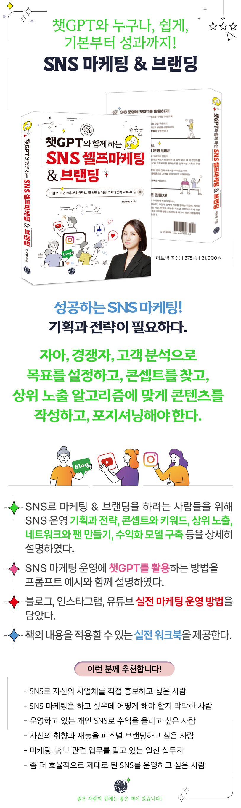 SNS를 이용해 누구나 쉽게 셀프마케팅을 하는 방법을 설명했다. 마케팅을 위한 SNS 기획과 전략, 콘셉트 찾기, 상위 노출을 위한 콘텐츠 작성, 방문자와 팬을 만드는 전략, 블로그/인스타그램/유튜브 실전 운영 방법, 수익화 모델 구축하기, 브랜딩 방법 등을 상세히 설명했다. 그 모든 과정에 챗GPT를 활용하는 방법을 프롬프트 예시와 함께 설명했다. 각 챕터별로 책의 내용을 적용할 수 있는 실전 워크북을 제공한다.