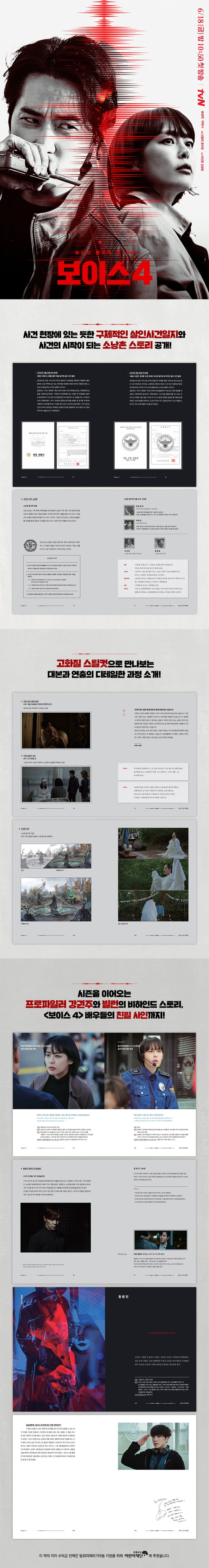 『〈보이스 4 : 심판의 시간〉 메이킹 스토리 & 대본집』은 국내 대표 장르물 드라마 tvN 〈보이스〉 시즌 4의 제작 과정을 기록한 책으로, 드라마의 시놉시스와 대본은 물론 제작진과 배우의 인터뷰를 통해 현장 비하인드 이야기를 생생하게 담았다. 특히 이번 도서에는 시즌 4에 등장하는 캐릭터들의 고화질 스틸 컷과 함께 〈보이스〉 이전 시즌에 등장했던 주요 인물들의 신상명세서와 함께 캐릭터 히스토리를 담아 〈보이스〉 시즌 전체를 리뷰할 수 있도록 구성했다. 그리고 대사, 소품, 연출이 어떤 디테일한 제작 과정을 통해 탄생하는지를 확인할 수 있는 페이지를 구성해 풍성한 볼거리를 전한다.