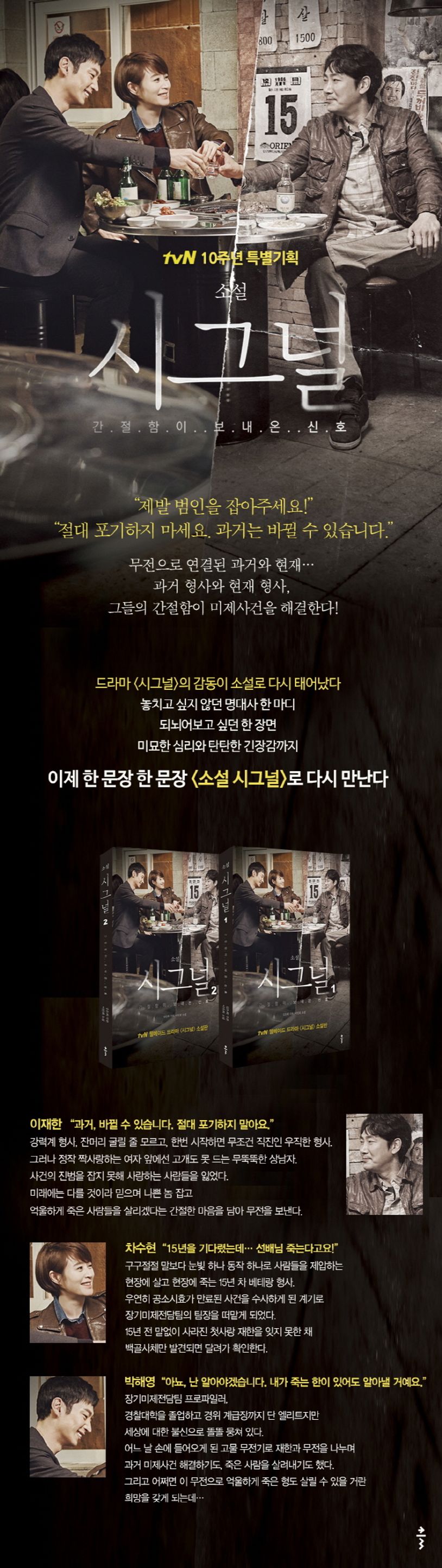 『소설 시그널 세트』 전2권. 무전기로 연결된 현재의 형사와 과거의 형사가 합심해 장기 미제 사건을 해결하는 내용으로 큰 화제를 모은 tvN 드라마 《시그널》을 소설화한 것이다. 과거와 현재의 무전을 통해 ‘포기하지 않으면 미래는 바꿀 수 있다’는 이야기를 그리며 안방을 전율시킨 드라마의 감동을 책을 통해 다시 한 번 만나본다.