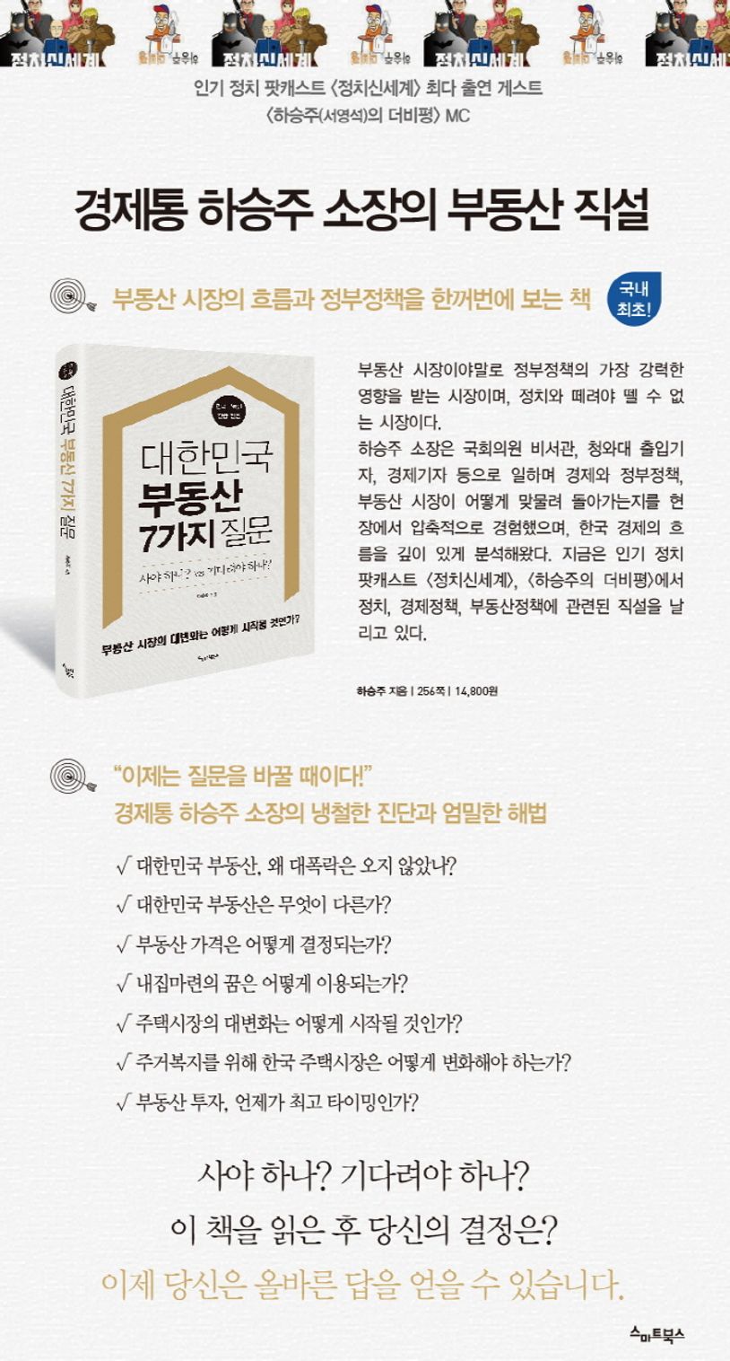 부동산 시장은 늘 우리의 기대나 낙심과는 무관하게 휙휙 변화한다. 어떤 때는 산들바람 같은 작은 변화가 오지만, 어떤 때에는 모든 것을 날려버리는 태풍이 불어닥치기도 한다. 그런데 정작 그 바람의 한가운데 있는 우리는 그 바람이 어디에서 불어오는지, 얼마나 강력한지 정확히 알지 못하고 온몸을 내맡긴 채 그 안에서 흔들리곤 한다. 최소한 시장에 불어오는 바람이 어떤 것인지는 알아보자는 것이 『대한민국 부동산 7가지 질문』의 목적이다. 저자는 이 책을 통해 작은 변화에 일희일비하다가 큰 변화를 놓치고 지나가는 일은 모두가 흔히 겪는 실수이며 이를 피하기 위해서는 꿋꿋한 자기중심이 있어야 한다고 조언한다. 또한, 대한민국 부동산 시장에 이를 대입해본다면 시장을 움직이는 동인이 무엇인지 살펴보고, 시장이 갖는 보편적 특징과 고유한 특징이 무엇인지 따져보면서 있는 그대로 현실을 편견 없이 해석하려는 노력이 필요하다고 말한다.