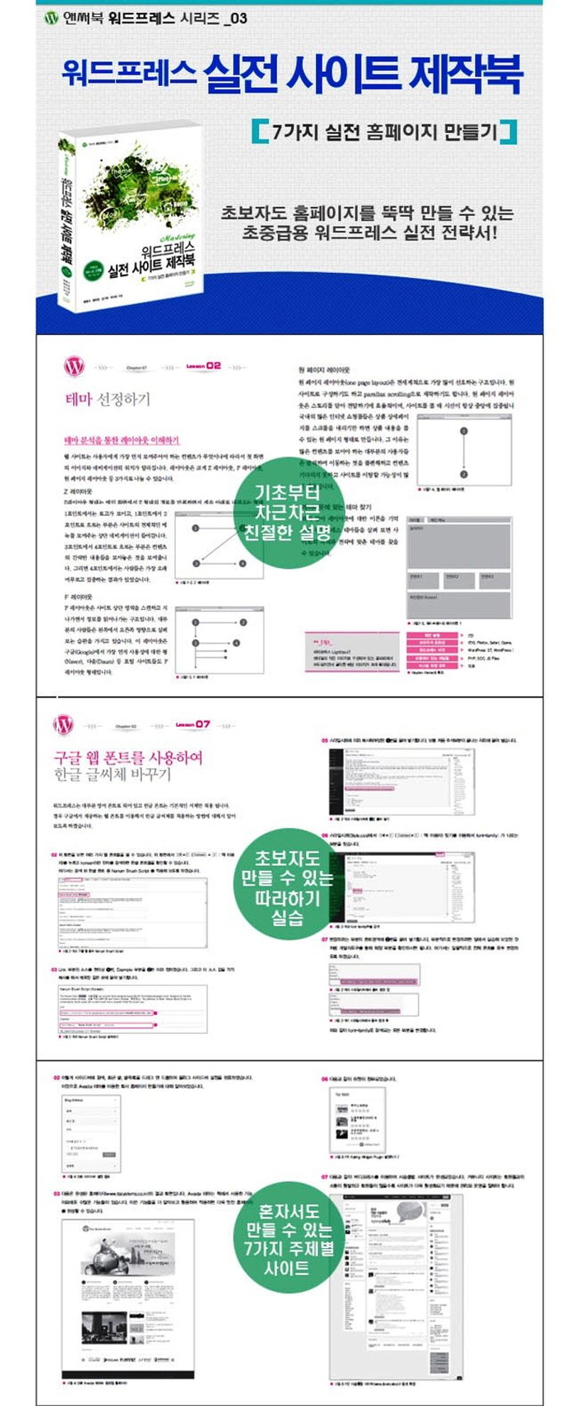 이 책은 워드프레스 설치, 테마 설치, 플러그인 설치, 관리자 페이지 등 핵심 기능을 이해한 후 국내 최대 규모의 워드프레스 커뮤니티 “워드프레스홈페이지” 카페 회원들이 선정한 워드프레스 테마 7개를 이용하여 사이트를 제작할 수 있도록 안내한 책이다.