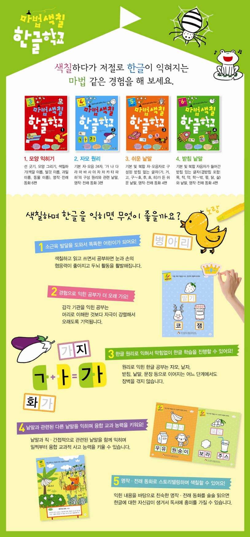 [마법색칠 한글학교]. 제3권 [쉬운 낱말]은 선 긋기부터 모양 익히기, 자모 원리 익히기, 쉬운 낱말 익히기, 받침 낱말 익히기 등 한글의 전 단계를 색칠을 하면서 즐겁게 익힐 수 있도록 기획한 것이다. 색칠은 손힘과 소근육을 길러주는 좋은 활동이고, 상상의 나래를 펼칠 수 있는 좋은 놀이 방법이다. 익힌 글자를 친숙한 명작 동화와 전래 동화를 색칠하고 읽으면서 확인해 보도록 구성하였다.
