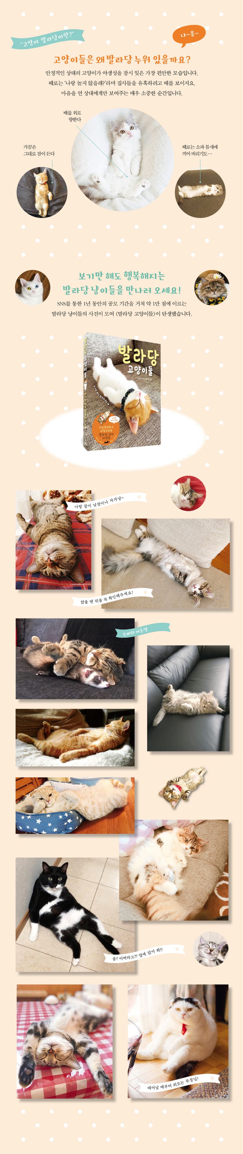 멋진 사진집은 세상에 많지만 〈발라당 고양이들〉은 전문 사진작가라도 쉽사리 만들 수 없는 것입니다. 가족 앞에서 귀엽고 편안한 모습을 보여준 고양이들, 그리고 그 사랑스러운 순간을 포착한 집사님들의 참여로 이 특별하고 멋진 사진집이 탄생했습니다. 보기만 해도 행복해지는 우리의 발라당 냥이들을 만나러 오세요!