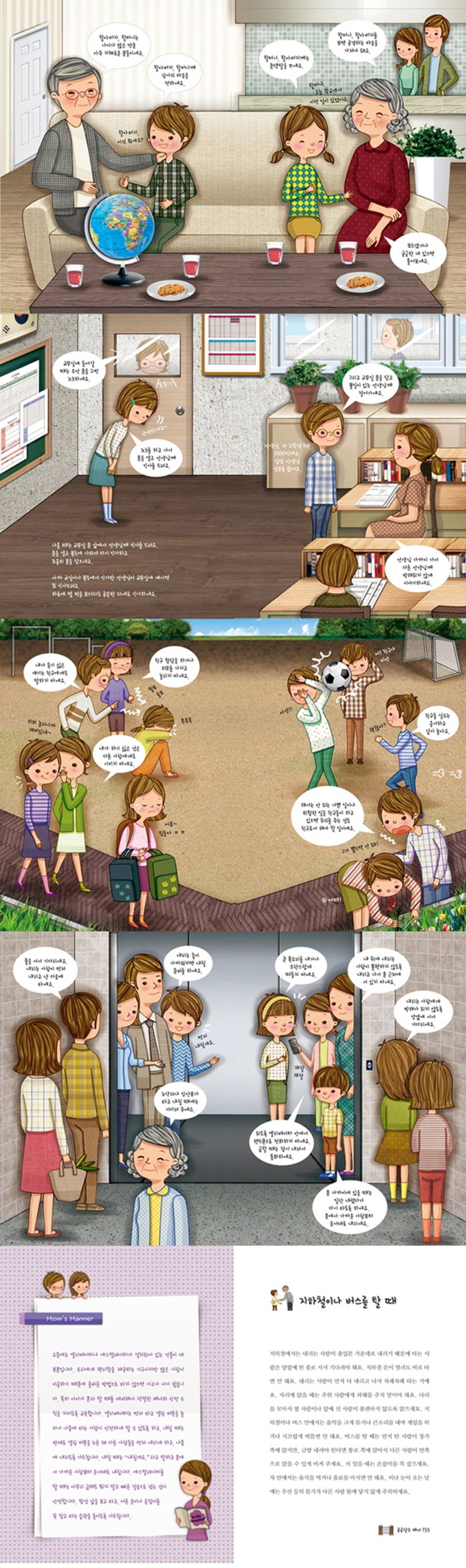 『매너야 이럴때 어떻게해?』은 아이가 읽는 페이지에서 왜 매너를 지켜야 하는지 이유를 설명하면서 예시된 각 상황에 맞는 매너를 아이들에게 알려줍니다. 그림 페이지에서는 아이가 재미있고 한눈에 상황 파악이 가능한 말풍선과 대사를 보면서 ‘나는 평소에 어떻게 행동했었지?’라는 의문을 갖게 되고, 그림에서 보여 주는 매너를 자연스럽게 익히게 됩니다. 엄마가 읽는 페이지에서는 아이에게 어째서 매너를 강조해야 하는지와 어떤 식으로 몸에 배도록 가르칠 수 있을지 제시합니다. 또 아이에게 강조하기만 하는 것이 아니라 엄마 역시 모범이 될 수 있도록 매너를 보여줘야 한다고 권유합니다.