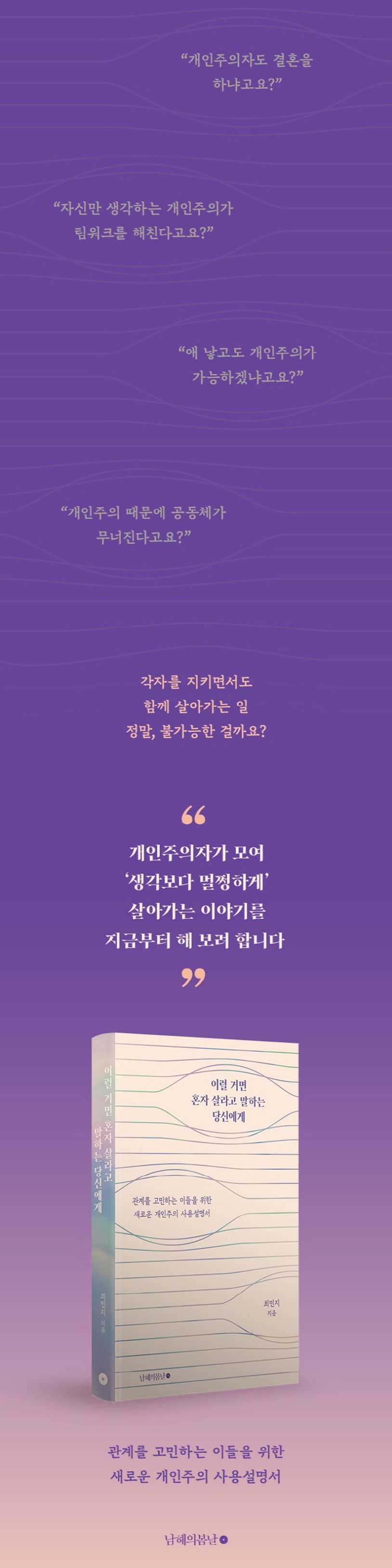 물론, 개인주의는 이기주의가 아니다. 하지만 우리 사회에서 ‘개인주의자’라는 표현은 “자기 자신만 아는 이기적인 사람”으로 치부되곤 한다. “개인주의 뒤에는 주로 이런 단어가 붙어 있었다. 팽배, 창궐, 만연. “행복이 팽배해요”, “기쁨이 창궐해요”, “사랑이 만연해요”라고 하지 않는 것처럼, 우리는 무언가 좋은 것에는 이 단어를 붙이지 않는다. 개인주의에 부정적인 가치 판단이 녹아 있다는 증거다.”(프롤로그 중에서) 서른다섯의 대한민국 청년이자 이 책을 쓴 최민지 작가는 외친다. “우리 사회에는 더 많은 개인주의의 팽배가 시급합니다!”라고.