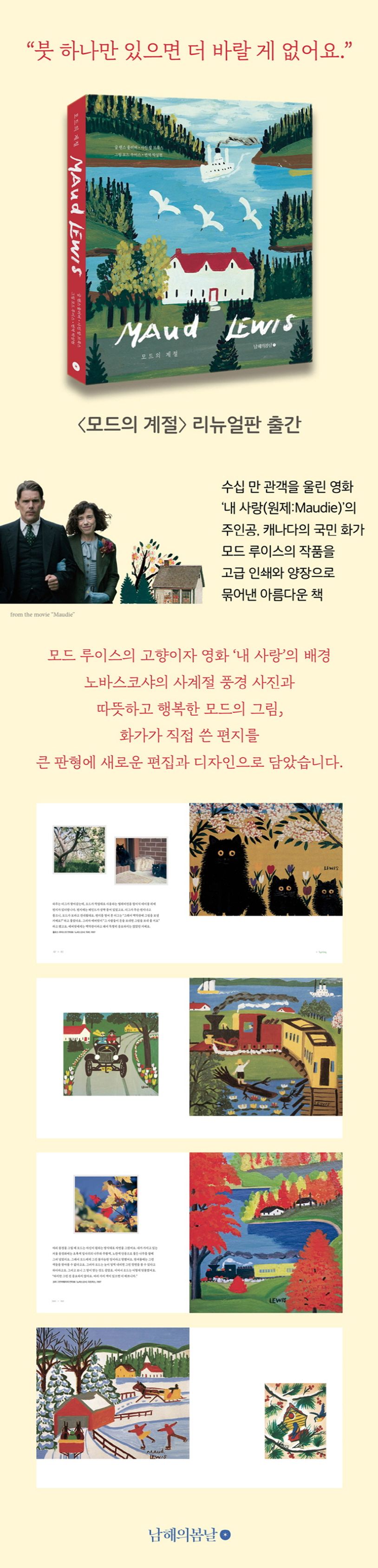 2022년 디자인 리뉴얼을 통해 새로운 모습으로 만나는 〈모드의 계절〉은 고급 종이에 인쇄한 그림이 돋보이는 큰 판형의 아트북으로 소장가치가 더해졌다. 또한 원서에는 포함되지 않은 모드 루이스의 그림 작품 6점을 추가로 수록해 모드 루이스의 그림을 사랑하는 독자에게 더할 나위 없는 선물이 될 것이다.