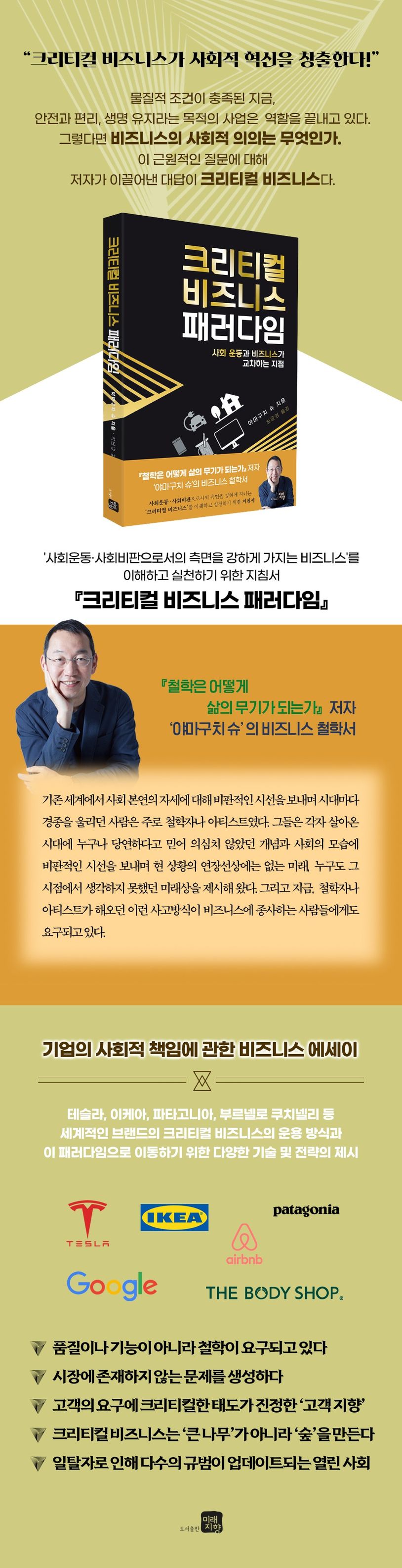 생존을 위한 기본적인 물질적 조건의 충족이라는 인류의 숙원이 차고 넘치게 이루어진 지금, 저자는 안전하고 쾌적하며 편리한 사회를 만든다는 목적에 관한 비즈니스라면 이미 역사적 역할을 끝낸 것일지도 모른다고 말한다. 그렇다면 이제 비즈니스의 사회적 의의는 무엇인가? 이 근원적인 질문에 대해 저자가 이끌어낸 대답이 ‘크리티컬 비즈니스’다.