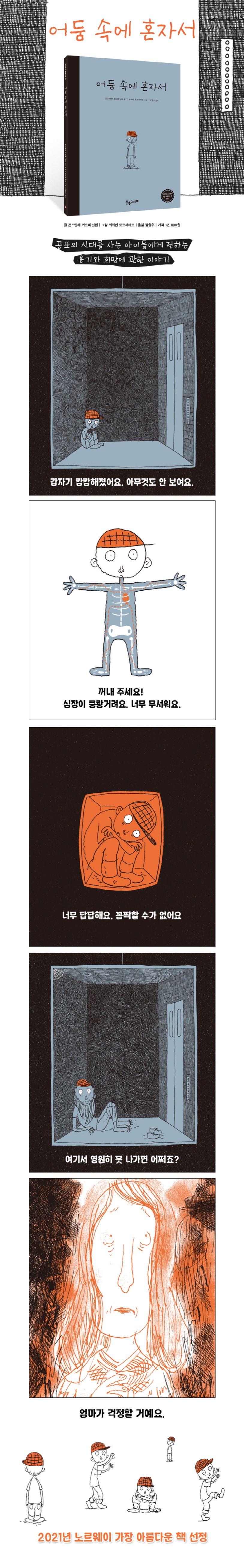《어둠 속에 혼자서》는 엘리베이터에 갇힌 아이가 행동에 관한 죄책감과 두려움을 이겨내는 용기와 희망에 관한 이야기입니다. 현대 사회는 아이들에게 일상의 두려움부터 질병과 전쟁과 환경 재앙 등 두려움 속에서 살도록 합니다. 아이들에게 두려움을 어떻게 이겨낼 것인지 엘리베이터라는 공간을 통해 이야기합니다.