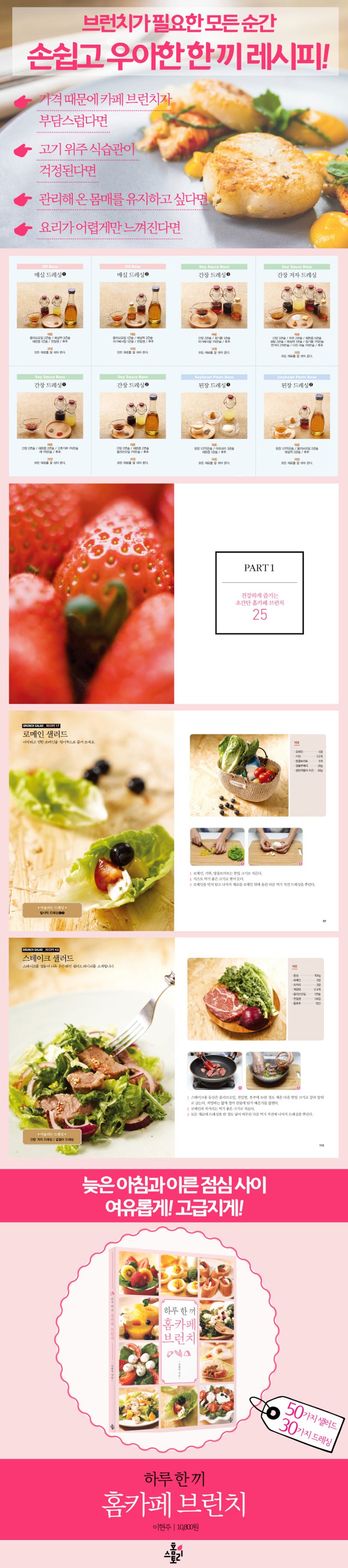 “브런치 카페는 예쁜데 너무 비싸요.”, “고기 위주 식습관인데 영양 밸런스에 문제없을까요?”, “저는 요리가 너무 어려워요.” 가격은 비싼데 금방 배고파지는 브런치 때문에 고민할 때, 건강 상태를 염려할 때, 레시피를 봐도 요리가 어려울 때 <홈카페 브런치>를 통해 나만의 브런치 카페를 열어보자. 10분이면 간단하게 만들 수 있는 건강 레시피부터 든든하면서 럭셔리한 레시피까지 <홈카페 브런치>에는 총 50개의 다양한 샐러드 브런치가 준비되어 있다. 샐러드의 기본인 아삭한 식감의 채소와 제철 과일 외에도 샐러드로 즐길 수 있는 여러 가지 재료를 활용하였다. 또한 샐러드 맛의 핵심인 드레싱 역시 자신의 취향대로 즐기도록 30종을 소개한다. 통밀 빵 한두 조각과 음료를 곁들이면 브런치 카페 못지않게 차릴 수 있는 레시피로 집에서도 분위기 있게 샐러드 브런치를 즐겨 보자.