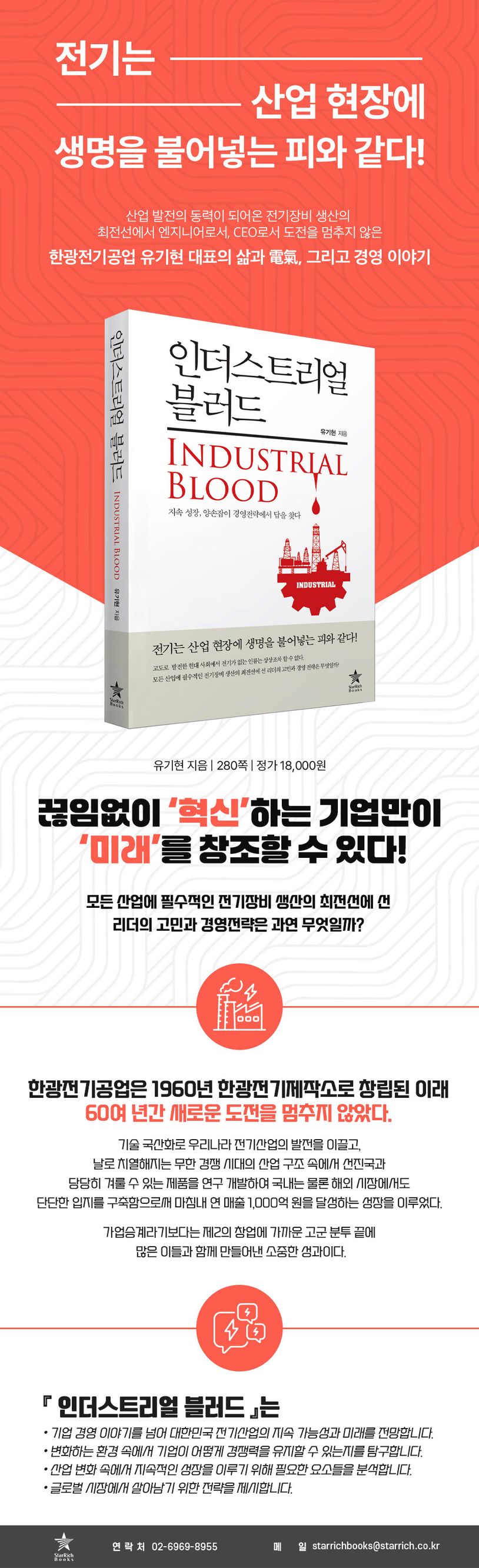 『인더스트리얼 블러드』는 대한민국 전기산업을 선도하는 한광전기공업 유기현 회장의 이야기를 담았다. 한광전기공업은 전력 설비와 배전반 제조 분야에서 두각을 나타내며, 끊임없는 기술혁신과 글로벌 시장 개척을 통해 도약해온 기업이다. 이 책은 변화를 주도하는 경영 철학과 지속적인 연구개발로 수십여 년간 도전을 멈추지 않은 그의 삶 그리고 경영 전략까지를 톺아본다.