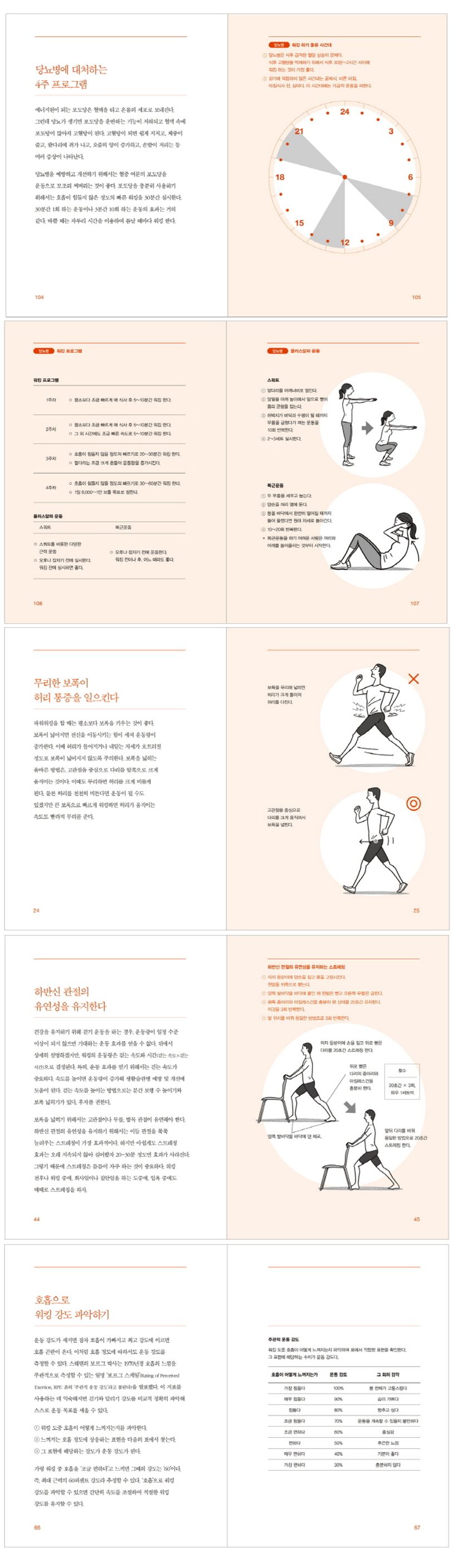 『증상별 4주 걷기 프로그램』은 각 증상마다 걷기 운동을 하면 좋은 시간대가 따로 있다는 특별한 정보를 담고 있다. 저자가 직접 설계한 4주 걷기 프로그램에는 걷기 좋은 시간대, 1주~4주 단계별 워킹 방법, 플러스알파 운동이 포함돼 있다. 예를 들어, 골다공증을 예방하려면 뼈의 생성이 활발하게 일어난 오후 1시~9시 사이에 물이 든 500ml 페트병을 양손에 들고 평소보다 조금 빠르게 걷는 것이 좋다. 더불어 뼈에 힘을 가해주는 점프 동작으로 자극을 주면 더욱 효과적이다. 또한 대사증후군이 걱정되면 평소보다 빠른 속도로 시간을 늘려가며 걷고, 걷기 운동 전후에 복부의 체내지방을 태우는 복근운동을 함께하면 좋다.