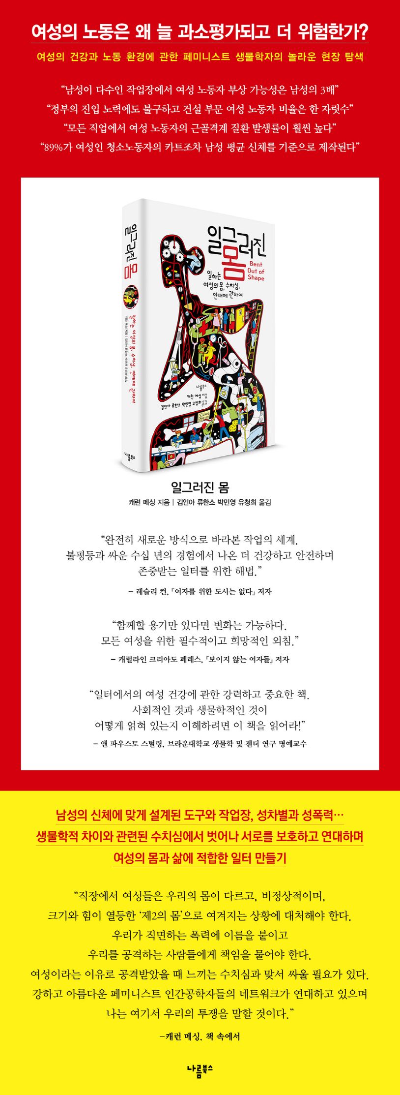 성별에 따른 건강 문제, 특히 일터에서 여성과 남성의 생물학적 차이를 어떻게 고려할 것인지에 관해 수십 년간 연구해온 페미니스트 생물학자 캐런 메싱의 신작이다. 저자는 전기통신, 조경, 간병, 청소, 서빙, 제조업, 돌봄서비스 등 다양한 직종의 여성을 만나 그들의 신체적, 정신적 건강 상태를 추적, 연구하고 남성 중심으로 설계된 일터 환경이 여성의 신체에 어떤 부정적 영향을 미치는지 폭로한다. 여성의 몸은 남성과 다르기 때문에 남성의 신체가 기준이 된 많은 직업에서 여성은 더 불편하고 더 많이 다쳤다. 아울러 여성은 일터에서 늘 남성보다 더 낮은 평가, 어려운 진급, 적은 급여라는 상황에 처해 있었고 일하면서 차별과 성폭력에도 노출됐다.