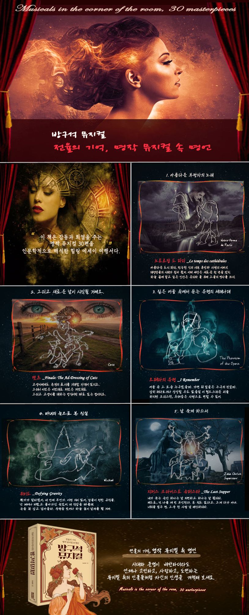 이 책에서는 시대와 운명이 배반하더라도 늘 해쳐나아가는 뮤지컬 속의 인물들을 통해, 우리들에게 다양한 인생에 대한 통찰과 감동을 줄 것입니다. 또한 뮤지컬이 품고 있는 배경과 서사부터 아름다운 가사 등, 어느 순간 공연장에 와 있는 듯한 느낌을 전달하고자 했으며, QR코드를 통해 명작 뮤지컬들의 대표 넘버들을 감상할 수 있습니다.