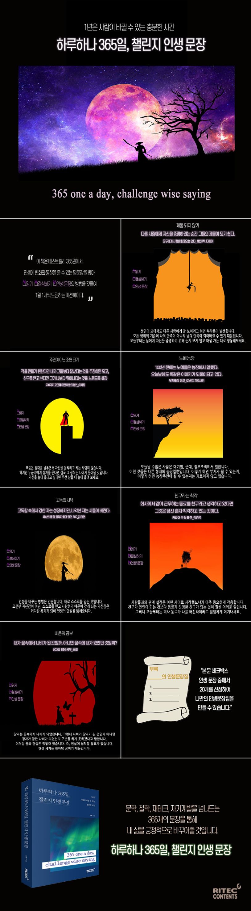책의 목차는 사계절에 맞게 도전/열정/인내/이성의 계절로 나누어져 있고, 당신과 365일을 함께할 이 책의 사용법은 한 문장을 읽을 때마다 꼭지마다 달린 ‘읽기’와 ‘결심하기’ 그리고 ‘인생 문장’ 체크박스에 표시하여 마지막 부록에 자신만의 인생 문장집 미션을 완성하는 것입니다.