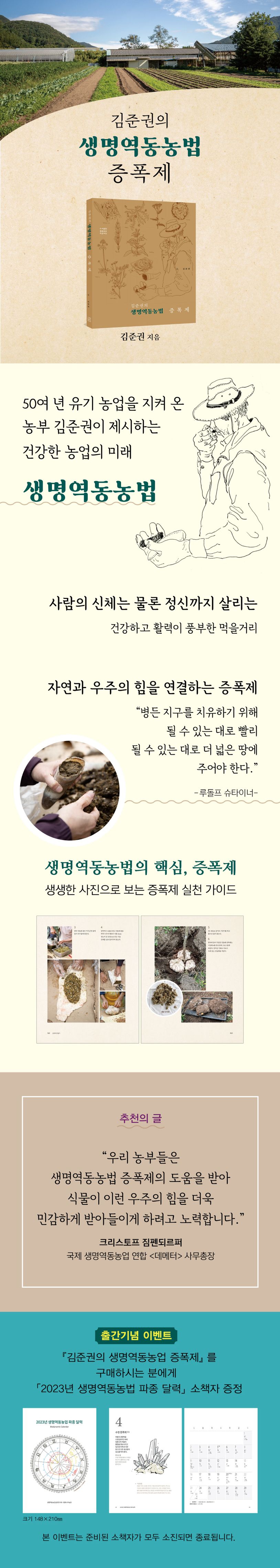 50여년 유기 농업을 지켜 온 농부 김준권이 제시하는 건강한 농업의 미래 〈생명역동농법〉. 전 세계 시장에서 최고로 인정받는 ‘데메터’ 농산물은 바로 〈생명역동농법〉으로 기른 것인데, 작물의 특성이 두드러지고 맛이 뛰어나며 활력을 풍부히 가지고 있다는 점에서 유기 농산물과 구별되고 있다. 〈생명역동농법〉의 핵심은 ‘증폭제’의 실천이다. 저자는 지난 20년 동안 증폭제를 만들고 농사에 적용한 사례를 자세히 소개하였다. 또한 만드는 과정과 농장의 모습을 사진과 그림으로 엮어 생소한 증폭제 만들기를 누구나 실천할 수 있도록 하였다. 기후 변화와 각종 사회 문제로 걱정이 많은 우리에게 용기와 희망을 전해 줄 책.