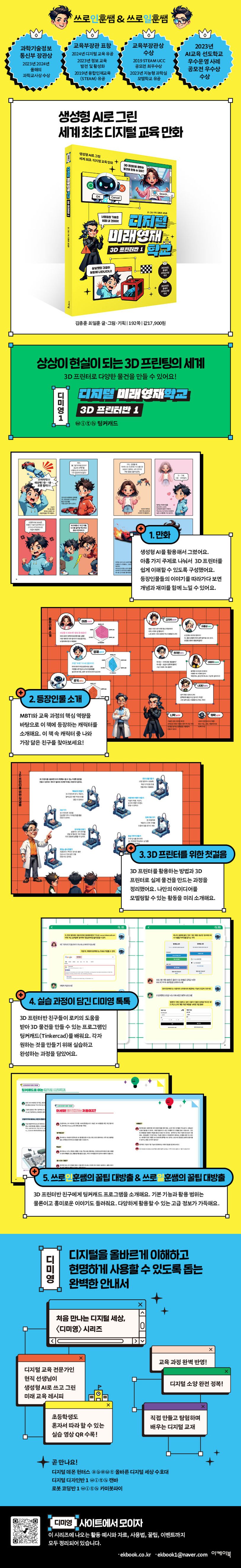 저자:김종훈 부산명문초등학교에서선생님으로일한다.생성형AI,3D모델링,메이커교육등디지털기반의융합수업을개발하고실천하고있다.지능형과학실,STEAM선도학교,AI교육선도학교운영등을통해다양한교육정책이학교현장에뿌리내리도록힘써왔다.또한교원연수와강의,유튜브채널〈쓰로인훈쌤〉을운영하며,실천사례도널리나누고있다. 전국교육자료전1등급수상,특허등록등여러성과를인정받아‘2024올해의과학교사상’(과학기술정보통신부장관상)을수상했다.‘아이들의손에서세상을바꾸는아이디어가시작된다’라는믿음으로,모든학생이상상하고표현하고협업하며미래역량을키울수있도록돕고있다.지은책으로는『우리들의무한상상실』,『MAKE?MAKE!』등이있다. 저자:최일훈 부산명진초등학교선생님으로일한다.과학과디지털,창의융합미래교육을연구하고실천하며,다양한창의융합교육을학교현장에서펼쳐나가고있다.지능형탐구키움터,재능계발탐색영재교육선도학교,디지털기반교육혁신선도학교등을운영하고있다. 세계창의력올림피아드,전국과학전람회등여러대회에학생들과함께도전하며경험을쌓았고,그노력의결실로‘2023올해의과학교사상’(과학기술정보통신부장관상)을수상했다.‘AI시대,인간만의창의성과올바른가치가미래를바꾼다’는믿음으로,누구나쉽고즐겁게체험하며아이들스스로미래를설계하고이끌어갈수있도록과학교육의새로운길을열어가고있다.지은책으로는『초등학교과학교과서』,『부산시교육청디지털소양교육교재』등이있고,다양한디지털·AI교육콘텐츠를개발하며이에대한글을썼다.
