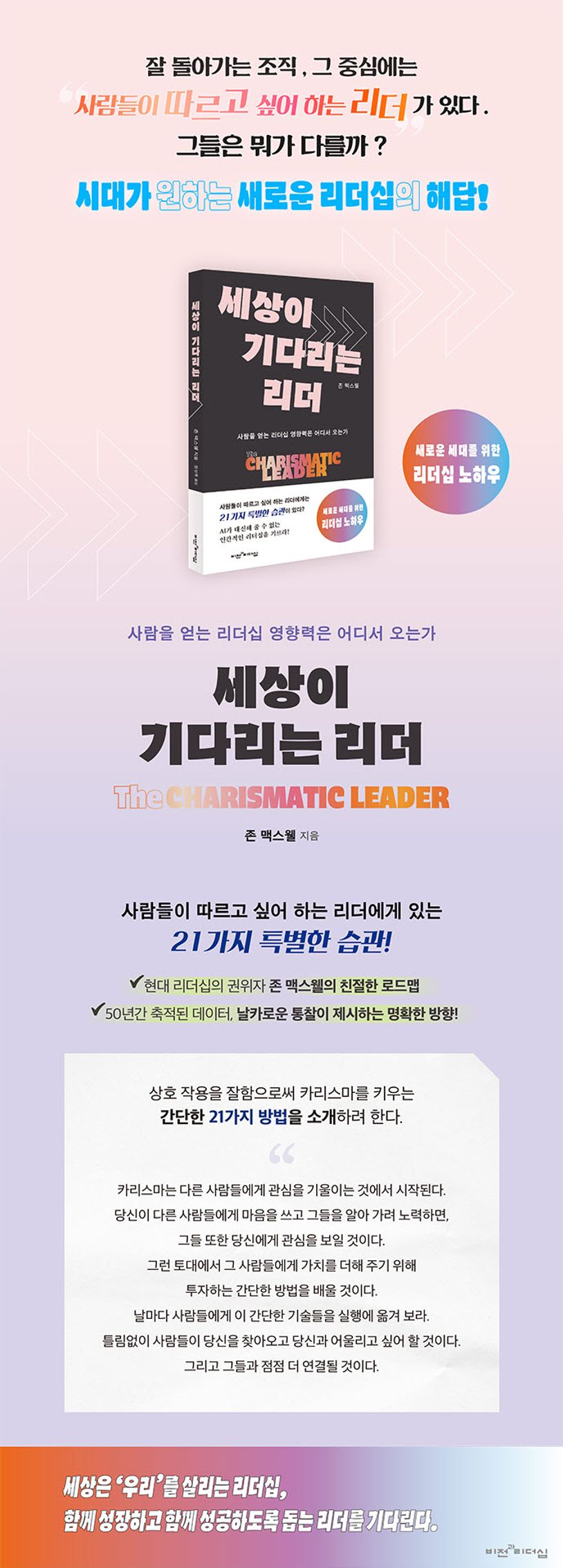 어쩌다 보니 리더가 되어 리더십이 뭔지 배우고 싶은 이들, 크든 작든 조직에서 현재 리더로 있는 이들, 더 효과적인 리더십을 발휘하기 위해 당장 실천할 수 있는 구체적인 방법을 알고 싶은 리더, 그리고 좋은 리더를 분별하고 지혜롭게 따라야 할 팔로워이자 예비 리더들을 위한 책이 출간되었다. 50년 넘게 다양한 직군의 리더십들을 컨설팅하고 코칭했던 세계적인 리더십 전문가 존 맥스웰이 오랜 세월 축적한 풍부한 사례와 현장에서 검증한 통찰을 바탕으로 이 시대를 위한 리더십을 제안한다. 변화하는 시대에 사람을 얻고 오늘과 내일을 이끌어 갈 ‘카리스마’를 갖춘 리더십의 21가지 기술을 이 책에서 마스터하라!