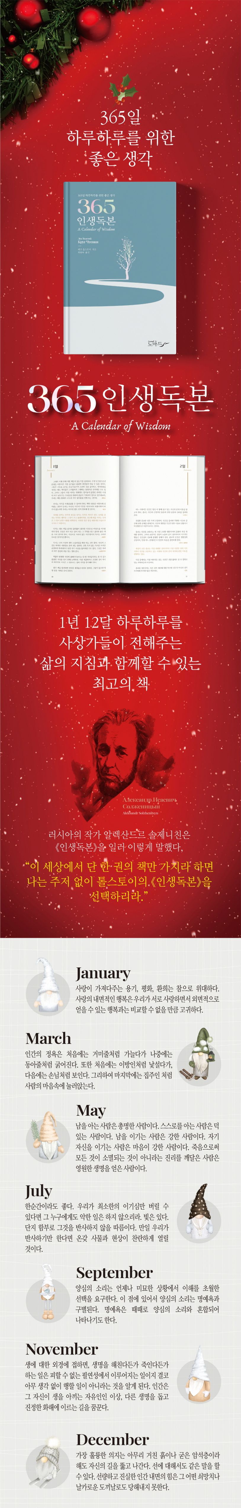 《365 인생독본》은 마치 일력을 넘기듯 독자들이 1년 12달 하루하루를 수많은 사상가가 남긴 삶의 지침을 만날 수 있는 책이다.