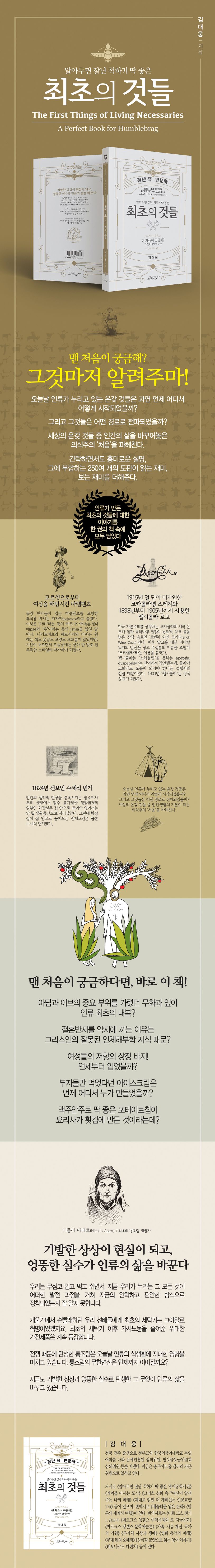 이 책 《알아두면 잘난 척하기 딱 좋은 최초의 것들》은 독자들의 꾸준한 사랑을 받고 있는 ‘알아두면 잘난 척하기 딱 좋은 시리즈’ 열 번째 책이다. 이 책의 키워드를 한마디로 정의하면 ‘인간의 의식주에 담긴 문화’다.