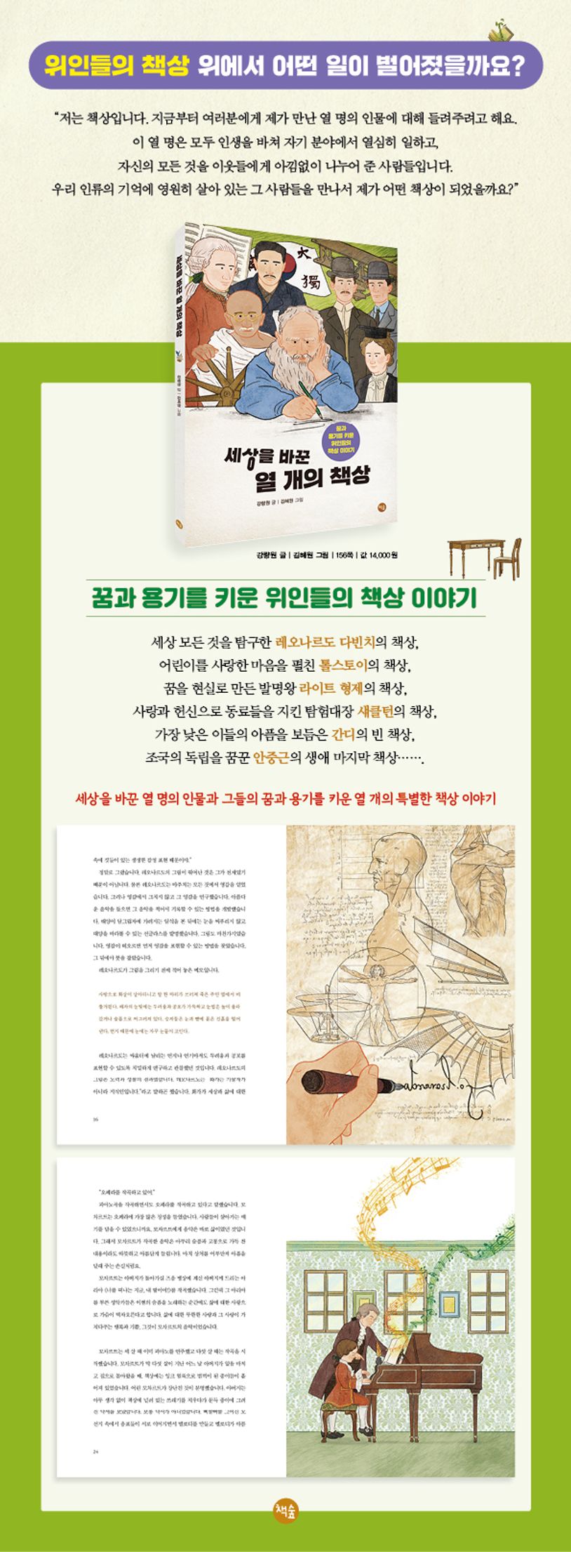 어린이를 위한 인물 열전 《세상을 바꾼 열 개의 책상》이 도서출판 책숲에서 새로 나왔습니다. 레오나르도 다빈치에서 시작하여 모차르트, 김정호, 톨스토이, 라이트 형제, 섀클턴, 간디, 안중근, 아인슈타인, 헬렌 켈러까지 세계사에 방점을 찍은 굵직한 인물들을 시대순으로 구성하여 교과 연계성을 높이고, 꼭 알아야 할 역사와 인물에 대한 배경지식도 알차게 담았습니다.