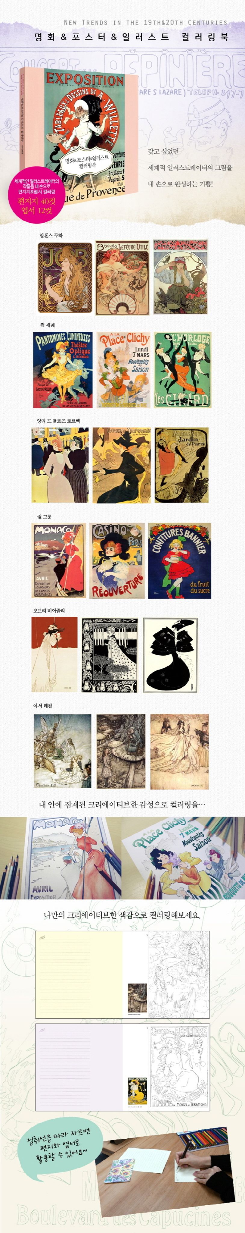 [명화 & 포스터 & 일러스트 컬러링북]은 예술로 승화한 19세기의 명화, 포스터, 일러스트 등 대중예술 작품을 모아 자신만의 컬러링 세계를 창조할 수 있도록 구성한 편지지&엽서 컬러링북이다. 수록된 작품은 편지지 40컷, 엽서 12컷이며, 편지지와 엽서로 활용할 수 있도록 크기를 편지지와 엽서에 맞추고, 종이도 이에 맞춤한 종류로 제작하여 완성도를 높였다. 컬러링에 도움이 되도록 포스터와 일러스트의 배치한 것도 눈에 띈다.