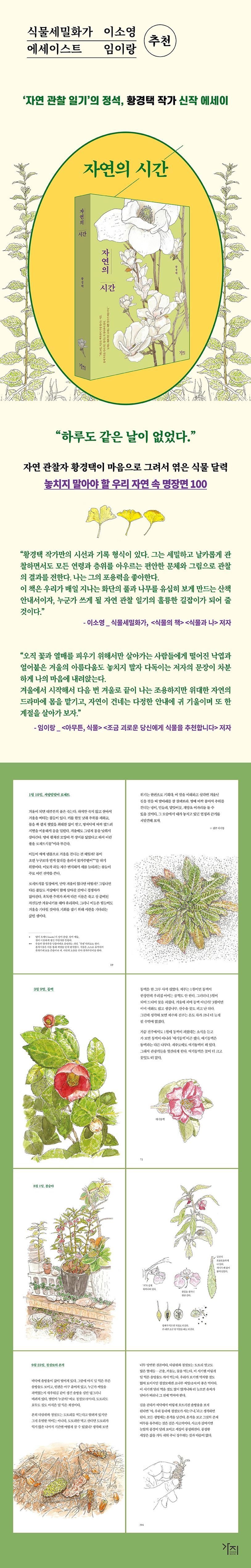 “어느 식물이나 제 모습을 뽐낼 기회가 일 년에 한 번 이상은 있다.” 《꽃을 기다리다》 《오늘은 빨간 열매를 주웠습니다》를 쓴 황경택 작가의 신작 에세이. 자연 관찰의 고수인 그가 매일 걸어 다니는 동네의 자연을 일 년간 관찰하며 우리 식물과 주변 생태계가 가장 빛나 보이는 순간을 포착했다. 먼 겨울산에서 생명의 기운이 느껴지는 1월부터 까치가 집을 짓기 시작하는 2월, 귀룽나무 새잎이 명도 높게 빛나는 3월, 앵두꽃이 피는 4월 초… 그리고 솔씨의 여행을 배웅하는 12월까지. 일 년 사계절의 변화를 멋지고도 깊이 있게 마주할 수 있도록 안내한 식물 달력이다. 조금만 관심을 기울인다면 누구나 자기 집 문밖에서 쉽게 만날 수 있는 우리 자연의 100가지 명장면이 흥미로운 관찰 일기와 함께 한 권에 담겼다. 새해, 우리 땅에서 자라는 식물과 친해지고 자연의 소리를 더 잘 듣고 싶은 사람이라면 일단 이 책으로 시작해 보자.
