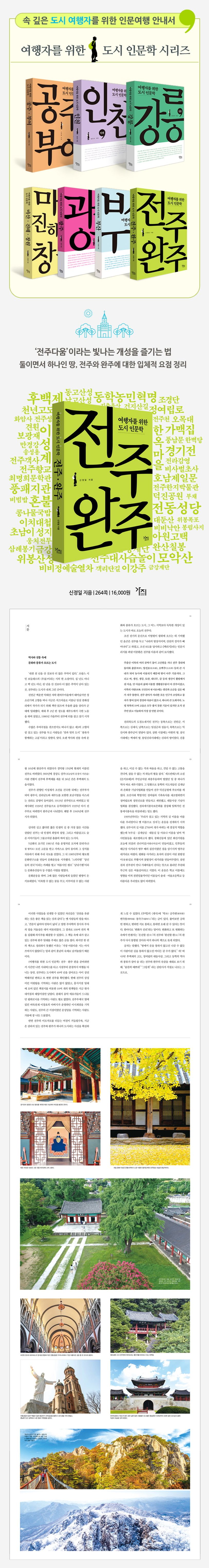 속 깊은 도시여행자를 위한 전주·완주 인문여행 안내서. 오랜 역사와 전통 속에 문화와 풍류가 흐르고 그 어느 지역보다 독특한 개성을 지닌 도시가 전주다. 조선을 건국한 태조 이성계의 조상이 살았다고 해서 객사의 이름조차 풍패지관(豊沛之館)이라고 붙인 전주는 동학농민군이 무혈입성을 한 뒤 전주화약을 맺었던 역사의 현장이기도 하다. 전라북도의 한복판에서 전주시를 감싸 안고 있는 완주군은 전주와 한몸처럼 역사와 자연을 공유하고 이름난 산과 절이 유독 많다. 100여 권의 책을 집필하는 동안 인생의 희망과 절망이 그물코처럼 촘촘히 짜여 있는 전주와 완주에 대한 저서를 훗날의 숙제로 남겨놓았던 저자는 이 책에서 도시의 시간 속에 아로새겨진 자신의 이야기를 시처럼 자연스럽게 엮어냈다. 그야말로 전주ㆍ완주로 떠나는 여행자를 위한 맞춤형 도시 인문학서다.