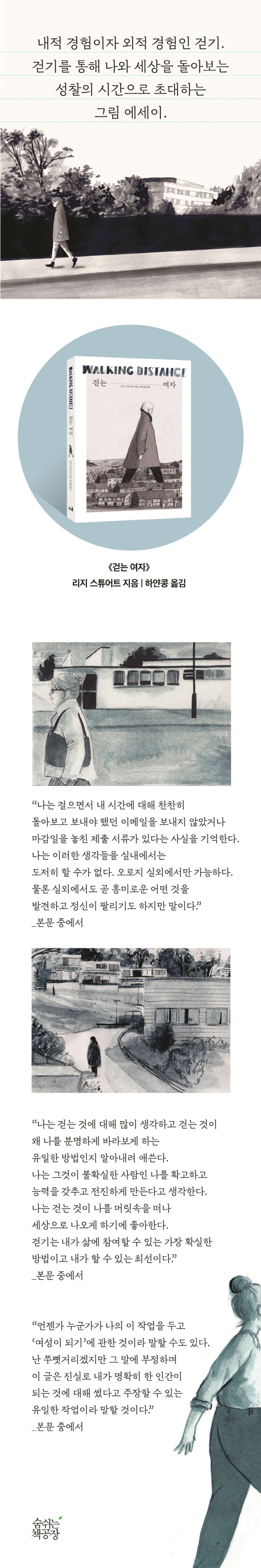 걷기는 외부환경과 마주하는 외적 경험인 동시에 나를 돌아보고 느끼는 내적 경험이기도 하다. 《걷는 여자》를 통해 외적 경험과 내적 경험을 함께하며 나와 내 주변의 고민과 문제의 답을 찾아보고 나만의 걷기의 즐거움 맛보는 것은 어떨까.