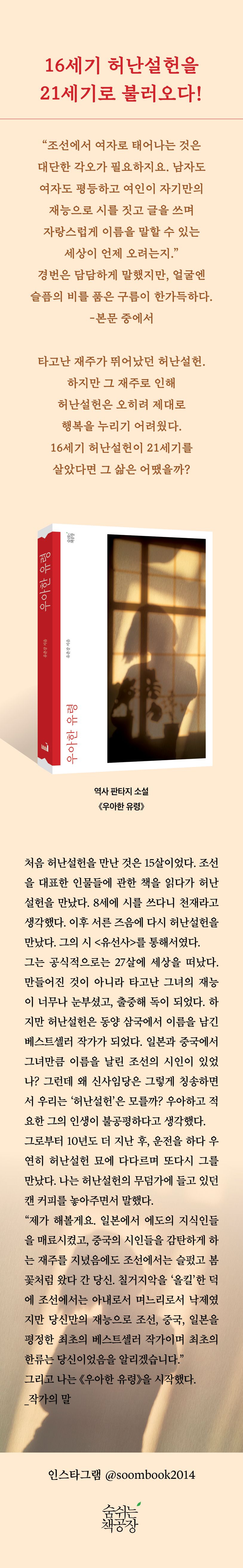 하지만 여성으로서 16세기의 허난설헌은 그리 행복한 삶을 살지 못했다. 혹독한 시집살이를 견뎌야 했고 아이를 잃는 아픔을 겪기도 했다. 특히 시어머니에게는 아들보다 문장 실력이 뛰어난 며느리 허난설헌이 눈엣가시였다. 남편 김성립과의 관계도 원만하지 못했다. 당시 삼국을 시로 사로잡았던 허난설헌이 21세기에 살았다면 과연 그의 삶은 어땠을까? 《우아한 유령》은 바로 그 상상에서 비롯한 역사 판타지 소설이다.