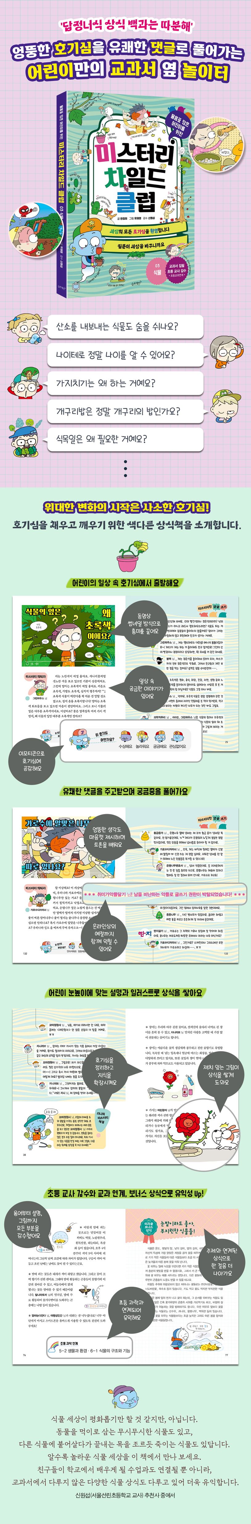 특히 이 책에서는 호기심을 ‘이해할 수 없는 이상한 일’을 뜻하는 ‘미스터리’로 부르며, 일상 속 궁금한 이야기들을 ‘미스터리 의뢰’로 꺼내 놓는다. 정답이 바로 제시되지는 않는다. 댓글로 토론하며 추리하듯 호기심을 푸는 방식으로, 어린이 스스로 정답에 접근할 수 있도록 길을 열어 준다. 동영상 썸네일, 이모티콘 등 어린이에게 친숙한 온라인 환경을 더해 호기심 자체로 놀잇거리가 되게 한 것도 특징이다. 또한, 클럽의 운영자 ‘지니’는 어린이 눈높이에 맞게 호기심을 해결해 주고, 꼬리에 꼬리를 무는 상식을 풀어놓는다. 딱딱해질 수 있는 설명에 재치 있는 그림을 곁들여 한층 재밌게 읽을 수 있다.