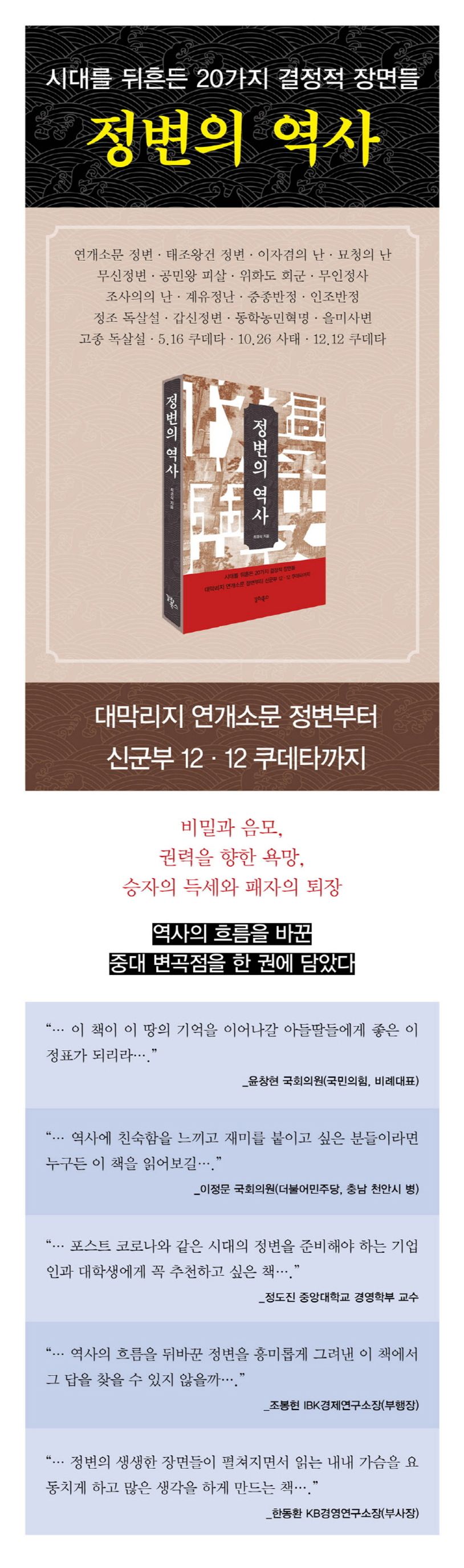 서문1부.정치상대변동[01]연개소문정변_고구려는천자의제국이다[02]태조왕건정변_혁명인가쿠데타인가[03]이자겸의난_고려판국정농단사건[04]묘청의난_조선역사1천년이래제1대사건[05]무신정변_고려문신들의씨를말리다2부.지배체제변혁[06]공민왕피살_고려의마지막개혁혼이꺼지다[07]위화도회군_조선건국의서막[08]무인정사_왕권과신권의대립이불러온참사[09]조사의의난_이성계와이방원,부자간의참극[10]계유정난_조선의헌정질서를뒤흔들다3부.극적인상승과몰락[11]중종반정_조선사최초의탄핵사건[12]인조반정_병자호란비극의단초[13]정조독살설_조선통사의서막[14]갑신정변_금수저청년들의3일천하[15]동학농민혁명_아래로부터반봉건·반외세를외치다 4부.고난과좌절[16]을미사변_조선의왕비가일본낭인에도륙되다[17]고종독살설_대한제국황제,의문사하다[18]5.16쿠데타_한국현대사의중대변곡점[19]10.26사태_박정희장기집권의종식[20]12.12쿠데타_어둠이내려앉다〈부록_이밖의정변들〉왕규의난/환국/하나회숙청정변연대기참고문헌추천사