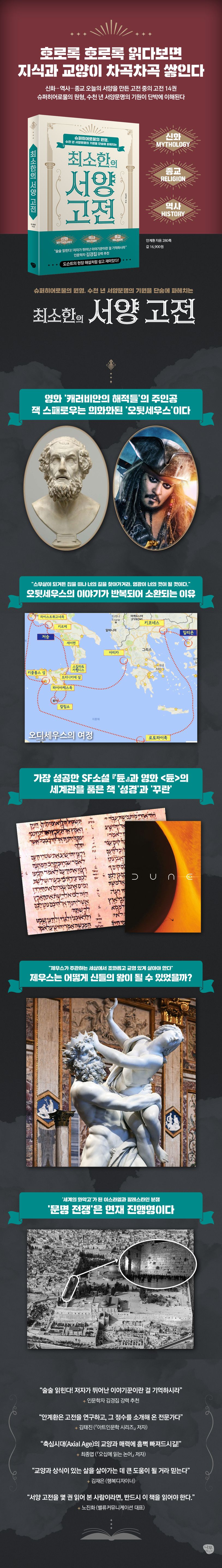 흔히 고전을 읽으려면 고전해야 한다는 말이 있지만 어떤 책을 잡느냐에 따라 달라질 수 있다. 동서양을 넘나들며 고전을 연구하고 대중 강연을 해온 전문가가 고전 중의 고전 14권을 톺아보았다.고전을 읽어보기는 해야겠는데 그 난해함 때문에 어려움을 겪는 독자를 위해 ‘최소한의 지식’을 제공하는 네비게이션 같은 책이다. 호메로스와 헤시오도스로 대표되는 신화 고전, 헤로도토스와 리비우스의 역사 고전, 유대교와 그리스도교의 종교 고전, 이슬람의 경전 ‘꾸란’까지 다루었다.