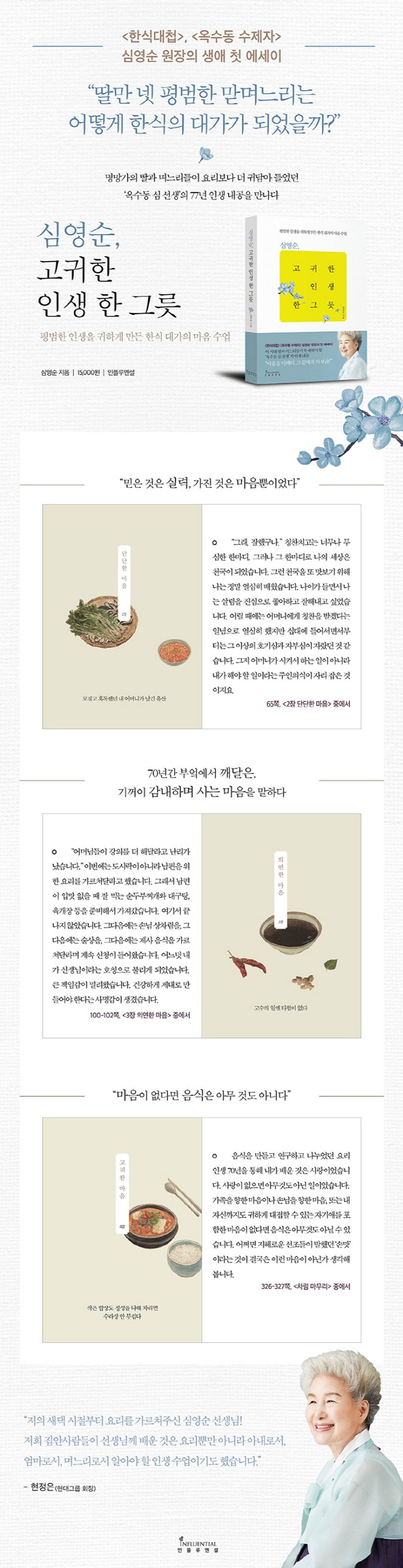 심영순 원장의 77년 인생 내공이 담긴 첫 에세이 『심영순, 고귀한 인생 한 그릇』. 사실 심영순 원장은 궁중요리 전수자 집안의 딸도 아니었고, 딸만 넷을 낳은 평범한 집안의 전업주부였다. 그랬던 그녀가 내로라하는 집안의 ‘요리 독선생’으로 이름을 알리게 된 것은 그녀 나이 서른이 갓 넘은 무렵이었다. 이 책에는 그로부터 40년, 요리선생이자 한식 연구가로 살아온 심영순 원장이 자신의 인생을 지탱한 8가지 마음이 담겨있다.