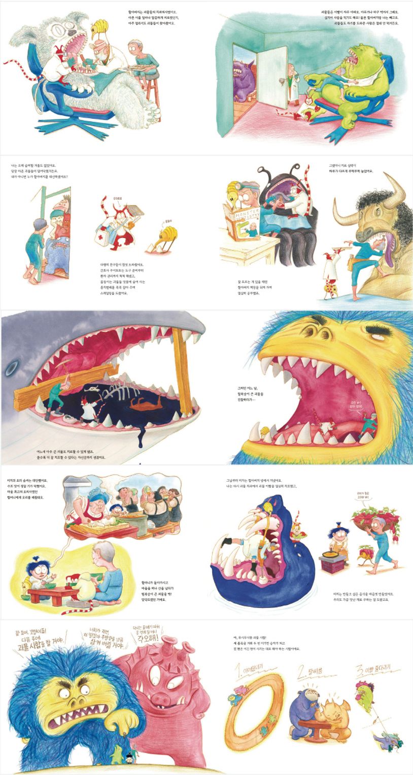 무시무시한 괴물도 무서워하는 곳, 바로 ‘치과’다. 괴물 치과에 모여든 괴물들은 저마다 크기도 모습도 성격도 다르지만 같은 점은 딱 하나, ‘아무거나 마구’ 먹는다. 무시무시한 괴물들도 아픈 이빨로는 하루도 먹고 살 수 없다. 그러니 치과에서 시작하는 이 책은 자연스레 우리가 먹는 것에 대한 이야기로 이어진다. 서로 잡아먹고 잡아먹히는 괴물 마을에서 아픈 이빨을 치료해주고 맛난 음식을 나누며 서로 먹이고 살리는 관계를 새롭게 만들어가는 괴물 치과 이야기.