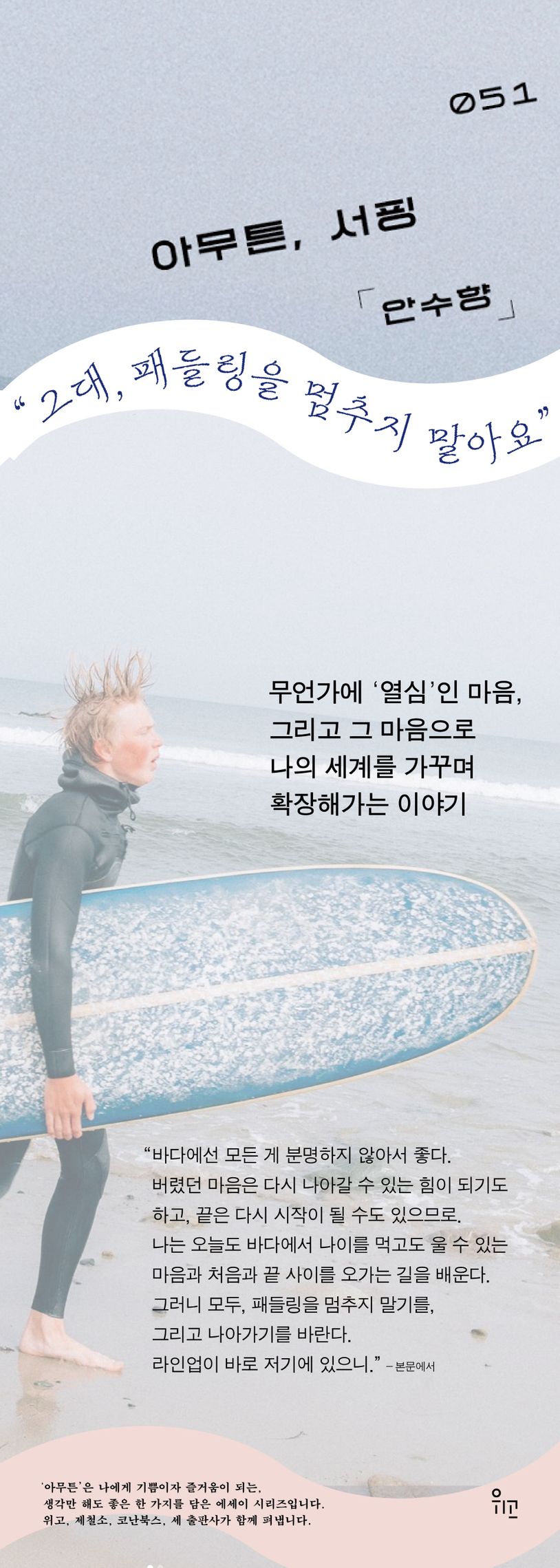 짐작했겠지만 서핑에 관한 명언이다. 그런데 서핑에 관한 이야기라기보다 현자가 들려주는 삶에 대한 진언(眞言)처럼 들리지 않는가? 삶을 서핑에 비유하는 경우가 많은데 서핑이 삶의 원초적인 무언가-즐거움인 동시에 두려움, 그리고 무엇보다 살아 있음-에 닿아 있기 때문일 것이다. 『아무튼, 서핑』은 어린 시절 배드민턴 선수생활을 하던 저자가 배드민턴 라켓 대신 카메라와 서프보드를 쥐게 되면서 삶의 큰 변화가 시작되는 이야기이다. 현재 사진작가로 활발하게 활동 중인 저자는 물방울에 홀려 카메라를 쥐게 되고, 우연한 기회에 서핑을 접하게 되면서 ‘물가에 서 있기보다 바다에 뛰어드는 삶의 태도’를 얻게 된다. 『아무튼, 서핑』은 그 변화의 과정 속에서 무언가에 ‘열심’인 마음, 그리고 그 마음으로 나의 세계를 가꾸며 확장해가는 이야기다.