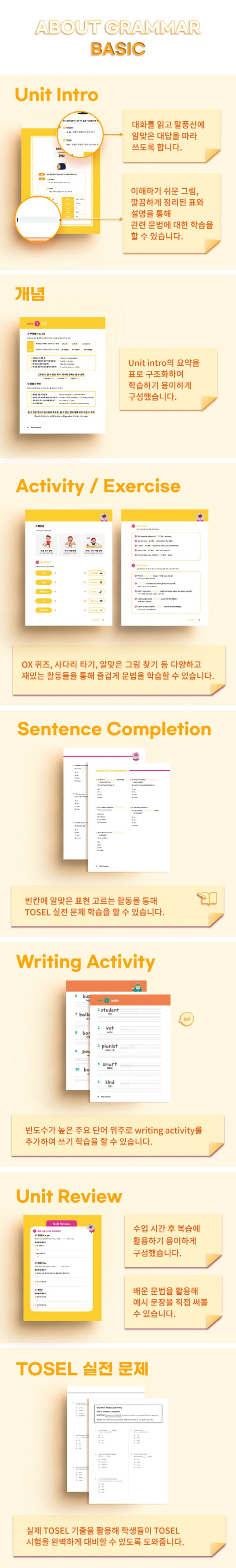 초등 교과과정 연계 문법 학습 및 세분화된 레벨링과 TOSEL 시험을 기준으로 빈출 지표를 활용한 문법 선정을 통해 TOSEL의 Grammar Series는 레벨에 맞게 단계적으로 문법을 학습할 수 있습니다.