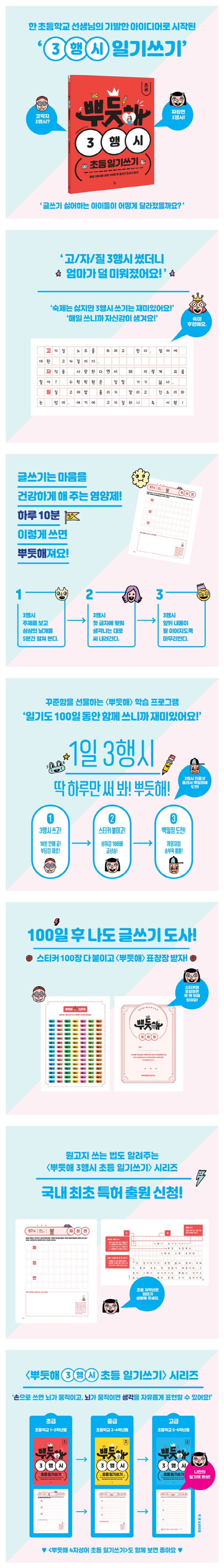 꾸준함의기적을선물하는온오프학습프로그램1.3행시쓰고→2.스티커붙이고→3.백일장도전<뿌듯해3행시일기쓰기>시리즈는아이들이100일동안꾸준히쓸수있도록온오프학습프로그램을만들었습니다.?오늘3행시일기를다썼다면?부록으로제공된스티커를붙일수있어요.?자신이봐도잘썼다고생각하는3행시가있다면사진을찍어‘뿌듯해백일장’에도전할수있지요.다른아이들은어떻게썼는지엿보면서백일장의장원이되기위해승부욕을불태울수있답니다.이렇게100일과정을다끝마쳤다면책마지막에수록된표창장을수상할자격이주어집니다.표창장을받은어린이는언제어디서든자신의생각을자유롭게표현할수있을거예요.원고지사용법도알게되는‘3행시일기쓰기’국내최초특허출원신청!<뿌듯해3행시일기쓰기>는원고지에씁니다.요즘아이들은컴퓨터로문서를작성하기때문에원고지사용법을모르는경우가많아요.하지만각종논술시험에서원고지를사용하므로미리알아두면좋습니다.원고지쓰기를하다보면맞춤법,띄어쓰기,문장부호사용법을자연스레알게되고글씨도예쁘게써집니다.초,중,고급별원고지본문구성은국내최초특허출원을신청했어요.학년별난이도에맞춰원고지사용법을익히는데큰도움이될거예요.