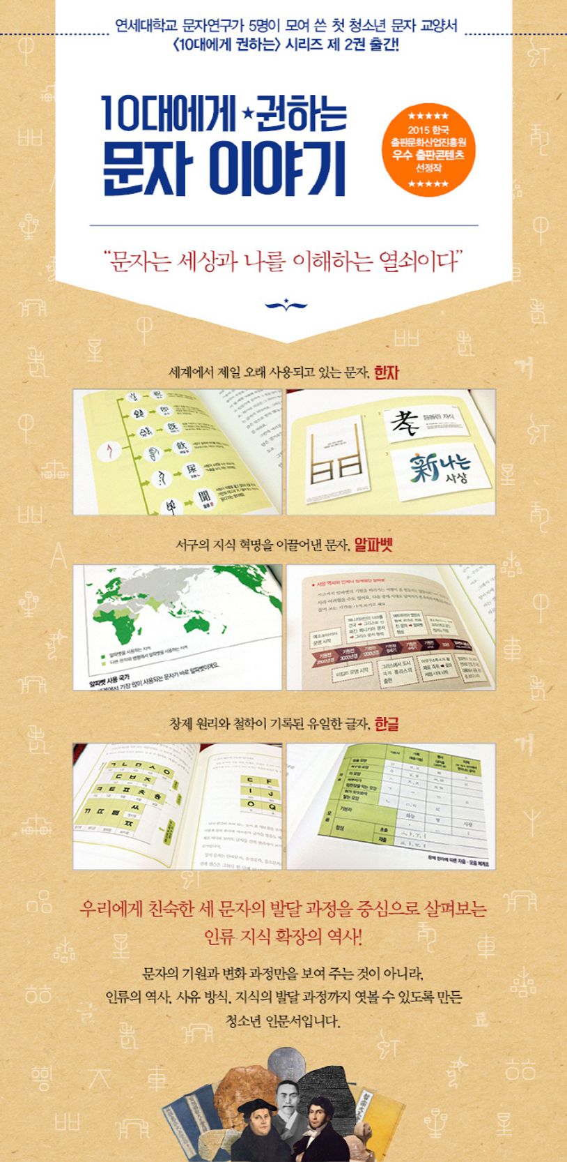 『10대에게 권하는 문자이야기』는 문자의 기원과 가치를 집중 조명한 첫 청소년 책이라는 점에서 주목할 만하다. 저자들은 청소년들이 문자의 기원과 가치를 정확히 이해하고 이를 통해 인류의 역사를 이해할 수 있도록 각각의 전문 분야를 살려 쉽게 풀어냈다. “문자는 어떻게 시작되었고 또 어떻게 발전해 왔을까?”“문자를 사용하기 전과 후의 차이는 무엇일까?” “문자가 가지고 있는 비밀은?” 등 호기심을 가질 만한 주제로 그동안 딱딱하고 어렵게만 느껴졌던 문자에 쉽게 접근할 수 있도록 다뤘다.