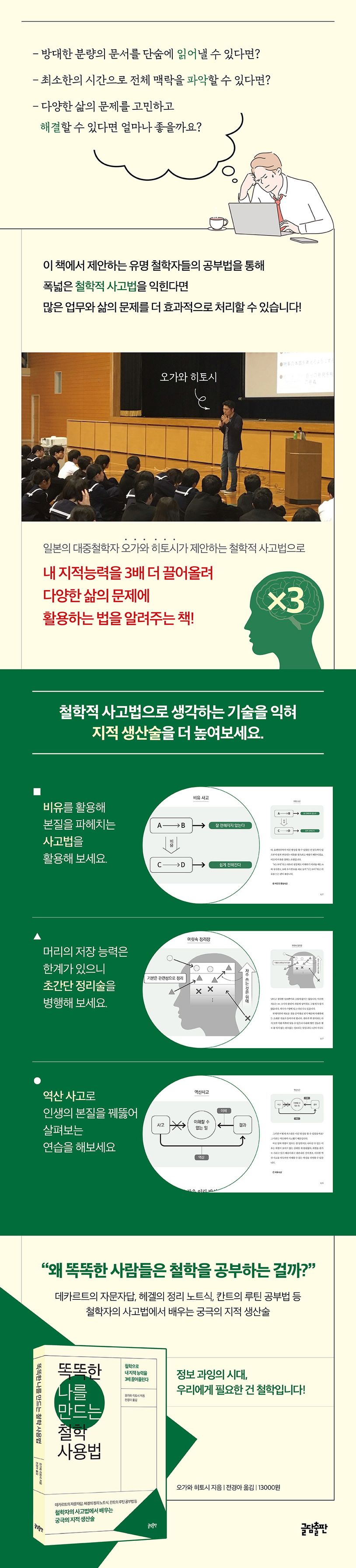 일본에서 주목받는 대중철학자인 오가와 히토시는 삶과 비즈니스 현장에 바로 적용 가능한 철학적 사고법을 알리기 위해 애써왔다. 그리고 그 결과물로 일반 대중들도 쉽고 간단하게 이해할 수 있는 『똑똑한 나를 만드는 철학 사용법』을 집필하였다. 정말 옳은 것이 무엇인지 찾고자 할 때 데카르트는 스스로에게 질문을 던지는 ‘자문자답 공부법’을 사용했고, 새로운 관점에서 대상을 살펴보려 할 때 칸트는 ‘일상 루틴 공부법’을 사용했다. 역사상 뛰어난 철학자들은 모두 자신만의 공부법을 갖고 철학을 탐구해왔고, 생각의 차원을 높여 자신을 한 단계 상승시켰다. 현실에 단단히 발을 붙인 철학 개념으로 새로운 관점을 제시하는 이 책을 통해 독자들은 사고력을 3배로 끌어올려 다양한 삶의 문제를 해결할 수 있게 될 것이다.