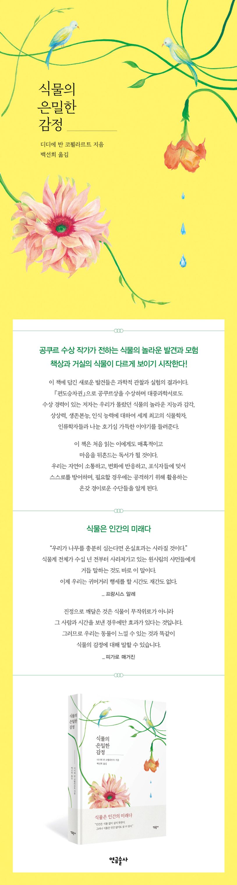 “우리에게 새로운 원천을 제공해주는 식물을 이해하려고 그들 자리에 서보려고 애쓸 때 우리는 더 인간다워진다. 식물이 우리의 불멸성을, 잃어버린 능력을, 눈먼 에고가 고삐를 틀어쥔 세상에 대한 통찰력을 다시 작동시켜주기를. 아니면 그저 우리를 매혹하고, 놀라게 하고, 뒤숭숭하게 마음을 흔들어주기를 바라자. 우리가 식물 덕에 느끼는 이 감정들은 어쩌면 본래 식물에서 온 것인지 모른다.”