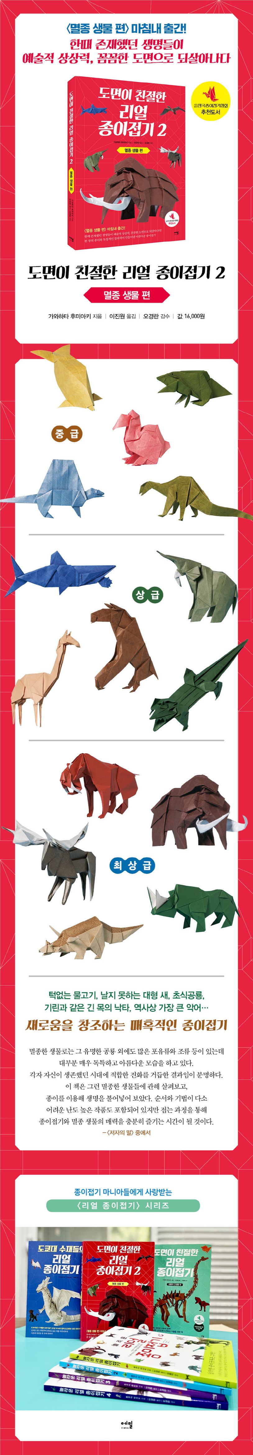 종이접기 마니아들 세계에서 스테디셀러로 자리잡은 〈리얼 종이접기〉 시리즈의 반가운 새 책 《도면이 친절한 리얼 종이접기 2 - 멸종 생물 편》이 출간되었다. ‘공룡과 고생물 편’에 이어 여러 다양한 작품과 친절하고 꼼꼼한 도면이 또 한 번 독자들의 눈길을 사로잡는다.