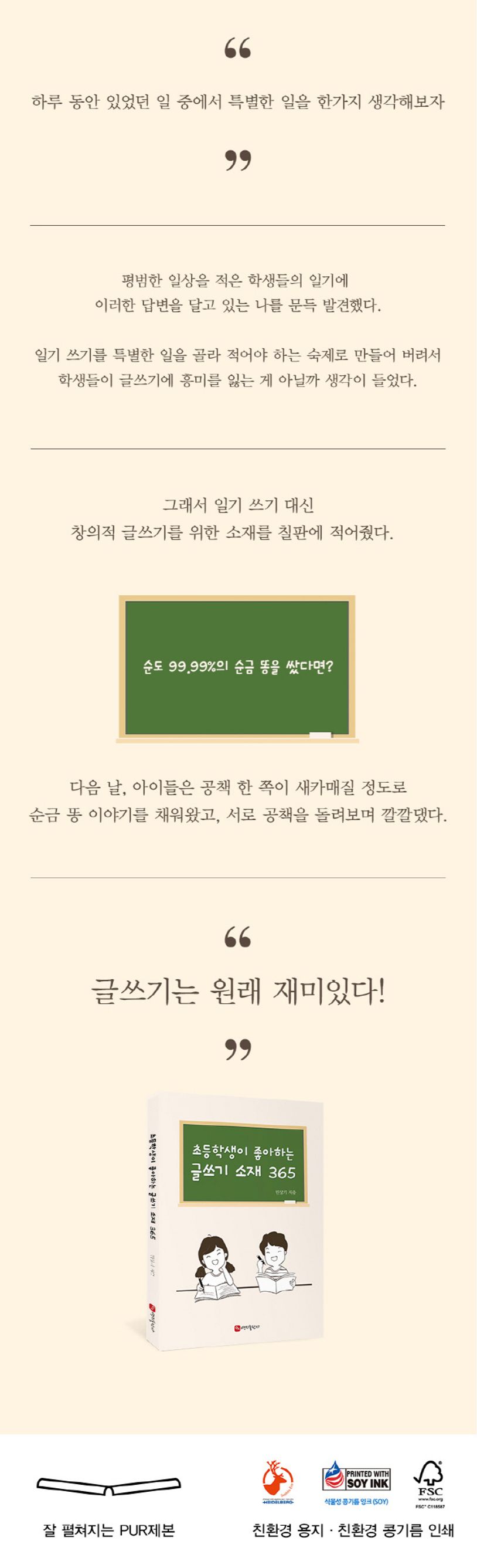 교직경력 3년차인 현직 초등학교 교사가 쓴 책이다. 학생들과 글쓰기 수업을 하면서 소재 고갈의 한계를 느낀 저자가 이를 해결해줄 글쓰기 소재가 담긴 책을 찾지 못해 직접 책을 쓴 것이다. 이 책에는 ‘모기에게 협박 편지를 써라.’, ‘얼마 전 내가 먹었던 치킨(닭)의 인생’, ‘바퀴벌레와 친구가 되는 방법’ 등 창의성과 상상력을 자극하는 글쓰기 소재 365가지가 실려 있다.